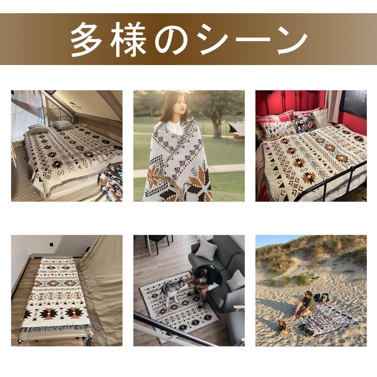 【多機能ブランケット】様々なシーンで活用できます。キャンプだけではなく、お宅やオフィスでブランケット、ひざ掛け、レジャーシートやピクニックマットなどとしては最適です。それに、デスククロスとソファーカバーにも高品な物です。使用サイズ:90*90cm/90*150cm/130*180cm/180*180cm/180*230cm