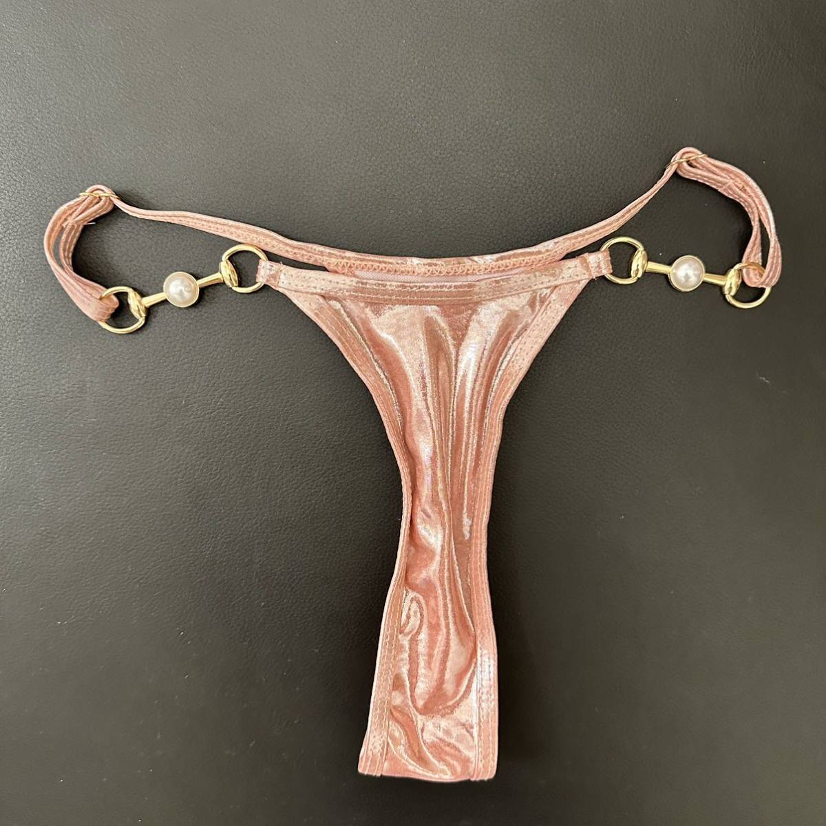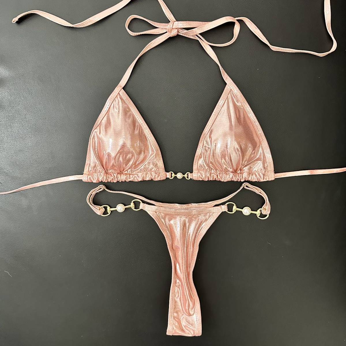 チャーム付き ホルターネックビキニ 上下セット レディース水着 エナメル ピンク