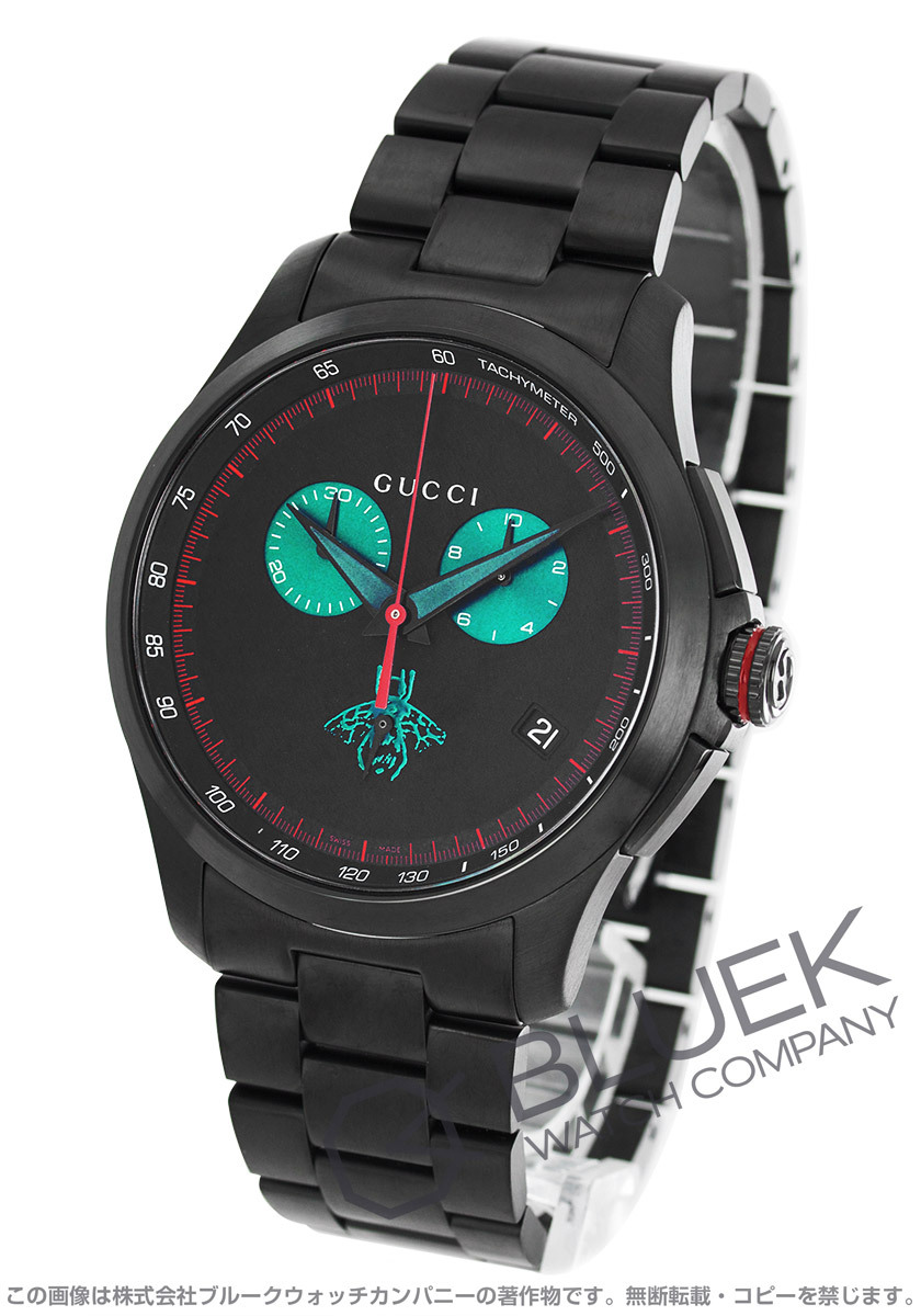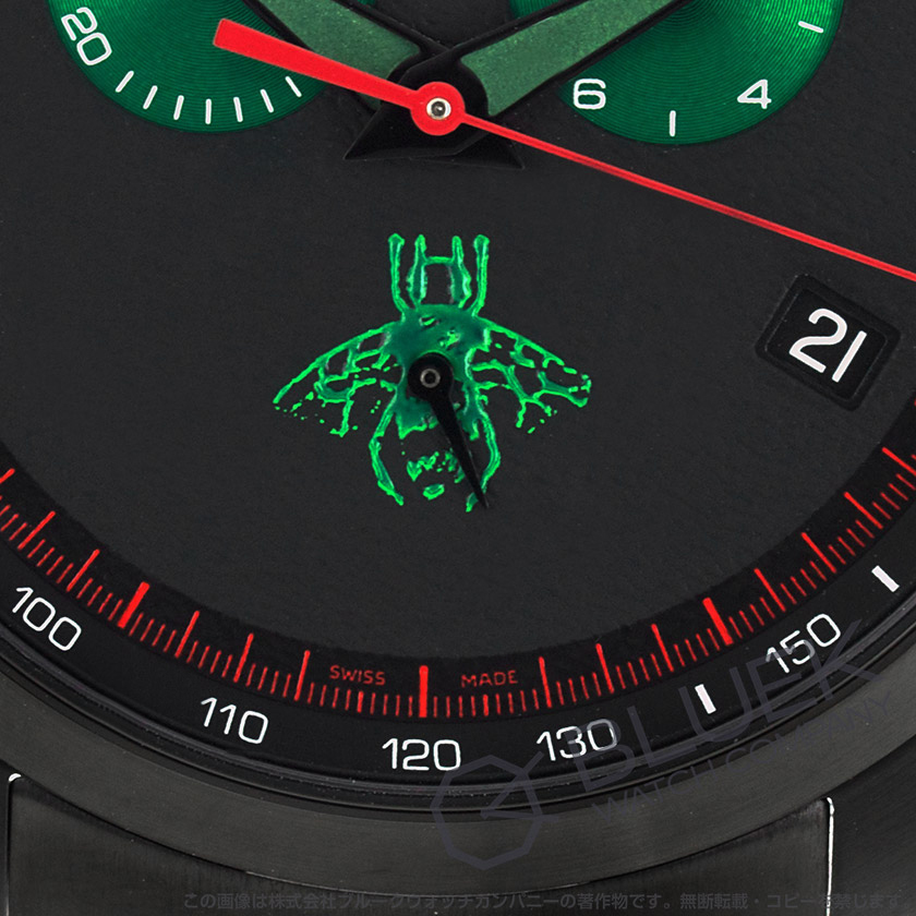 | 2015-16秋冬コレクションからグッチのクリエイティブディレクターに就任したアレッサンドロ・ミケーレ。一方Gタイムレスは時代や流行に左右されないクラシックな気品をモダンスタイルで表現するグッチ定番のタイムピース。このGタイムレスと氏が提案するヴィンテージスタイルをbee(蜜蜂)モチーフで融合させて人気です。中でも44ミリ大ぶりサイズのツヤ消しブラックケース&3連ブレス男らしいこのフルブラックモデルは、横型2インダイヤルとbeeのグリーン引き立つ6時位置のスモールセコンドが魅力。このダイヤルに外縁にスッキリ備えたタキメーターや差し色にレッドを効かせたクロノグラフ秒針や目盛りが映えて格好よく、抜群にクールな手元をつくります。 |