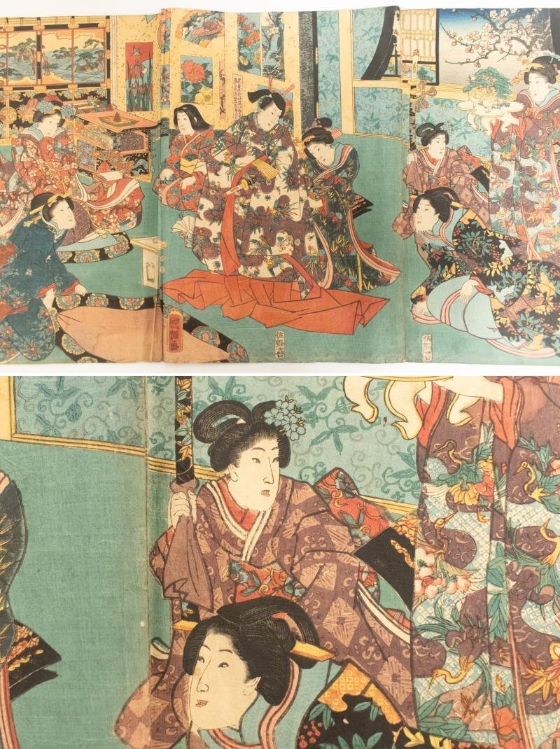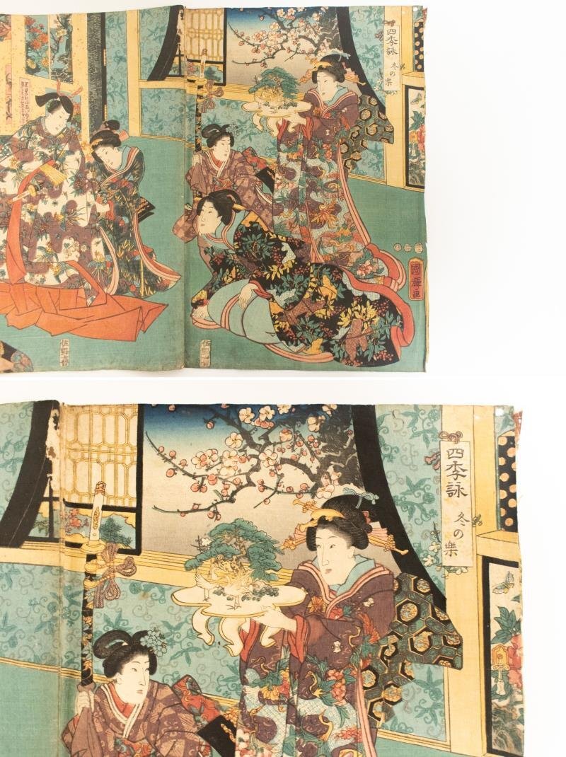 【中古】M▽歌川国輝 四季詠 冬の楽 1865年 木版画 美人画 浮世絵 錦絵 大判 三枚揃 三枚続 (K00380)