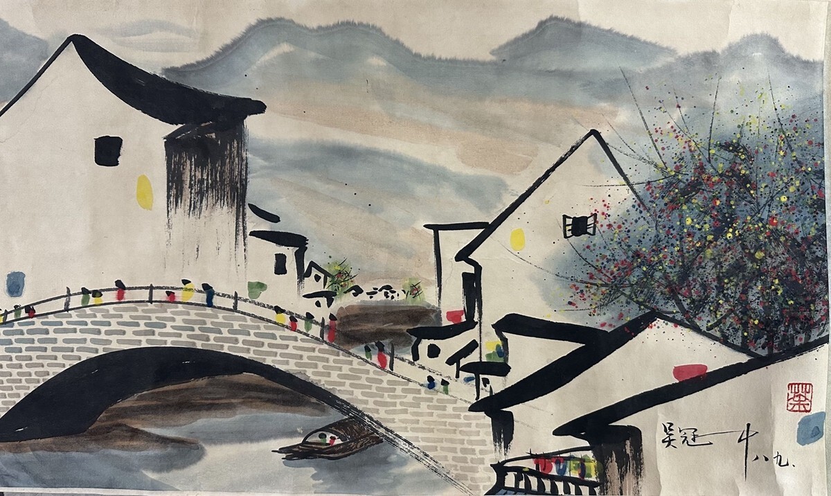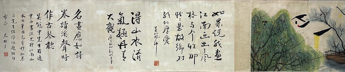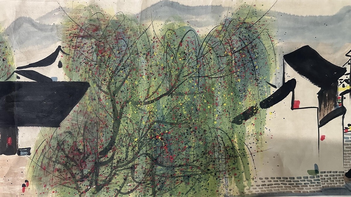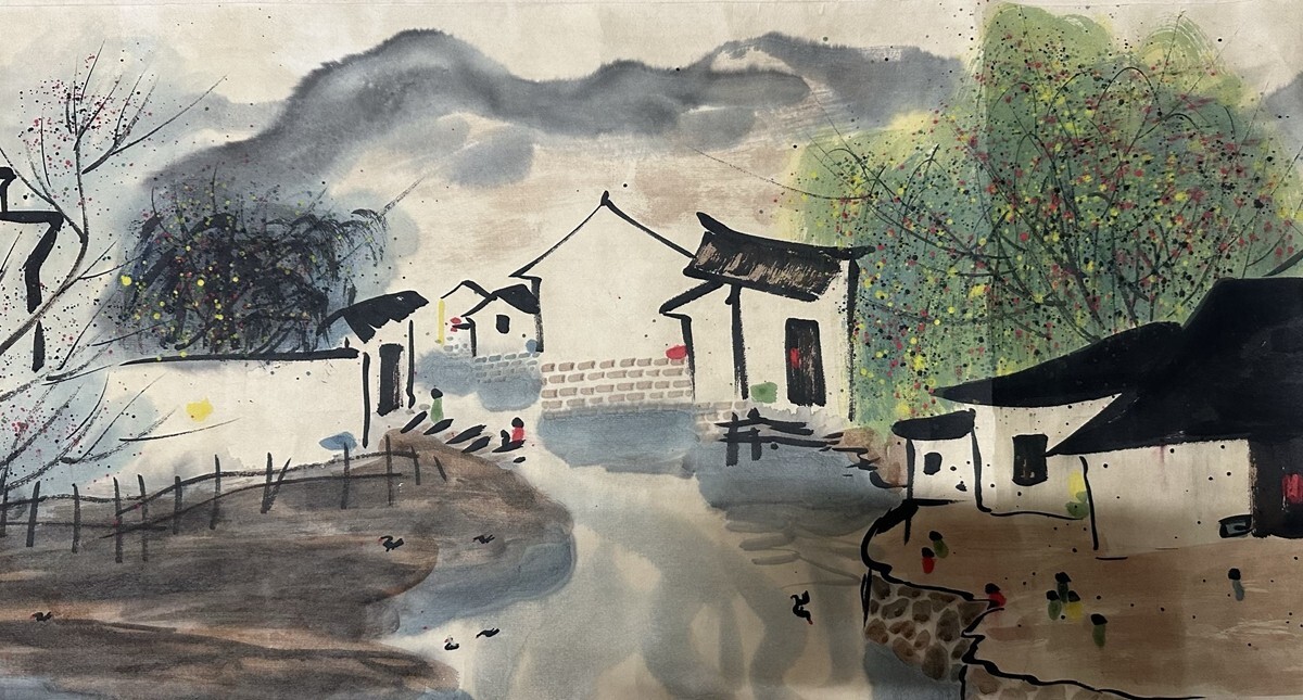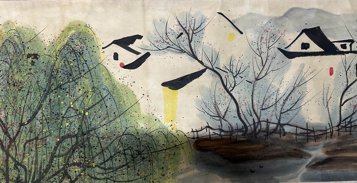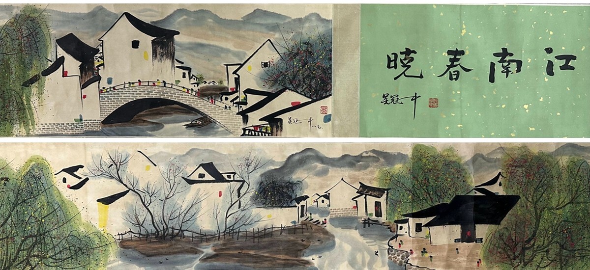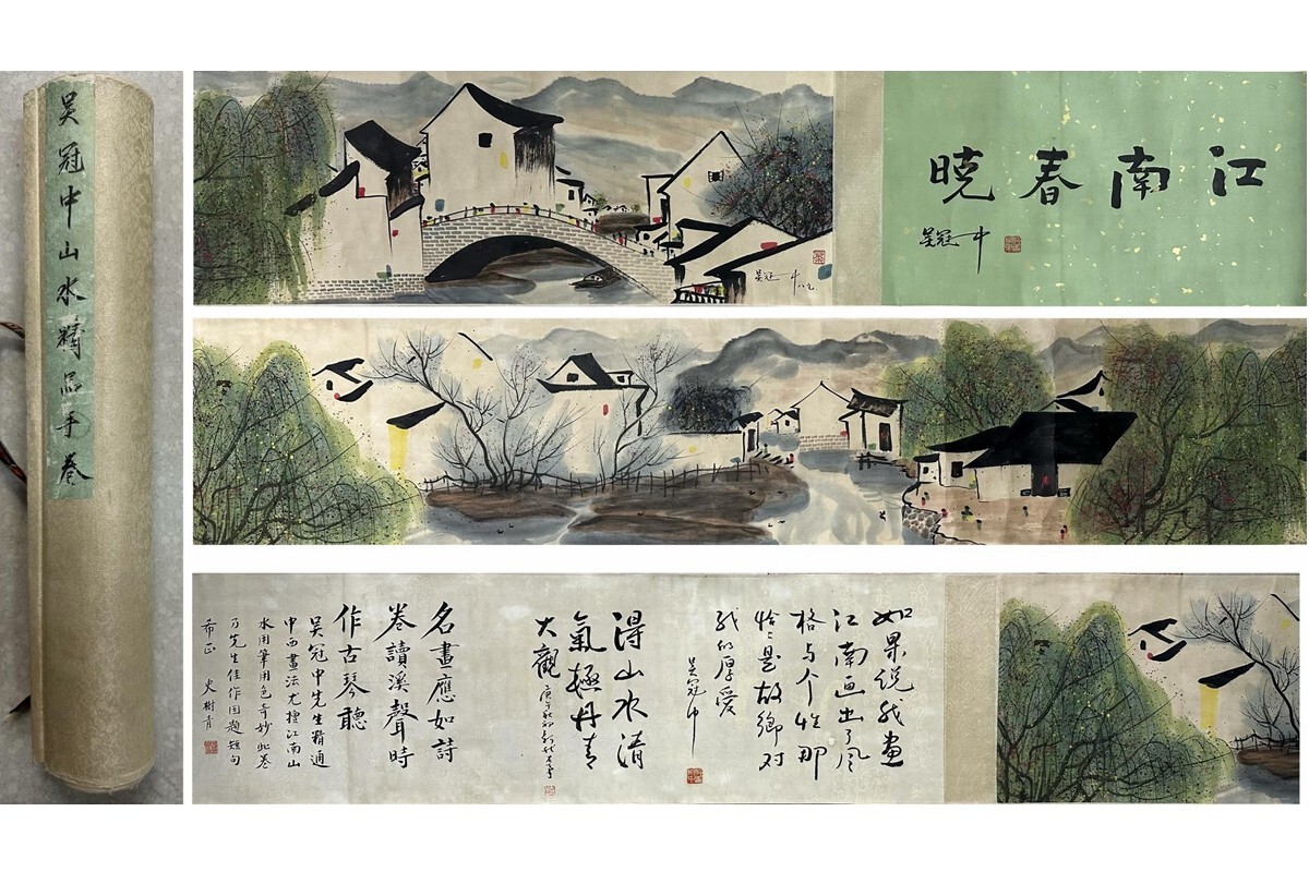 「呉冠中畫 江南春暁 山水図手巻」近代画家 肉筆紙本【仁】掛け軸 書画横軸 巻き物 中国書画 古美術 蔵出