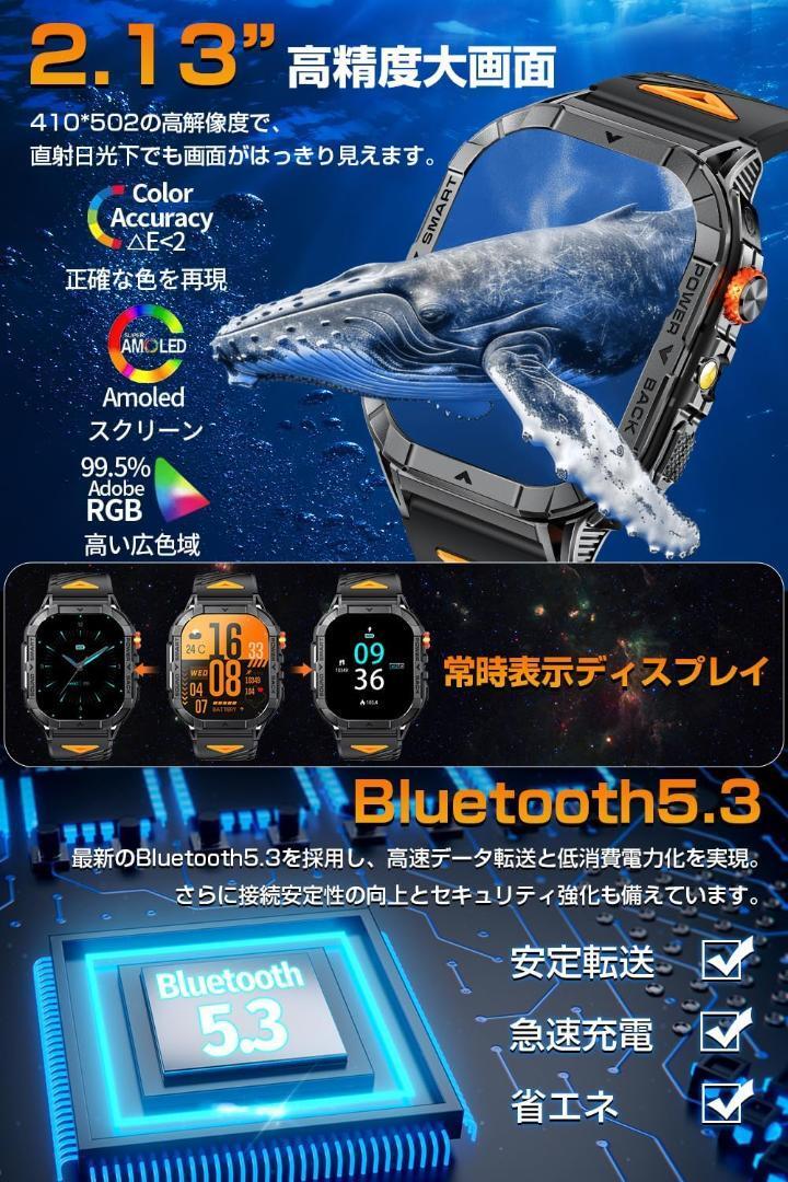 特殊な複合材料で設計されており、ファッションとアウトドアスポーツを完璧に融合させた新しい体験をもたらします。2.13 インチ AMOLED ディスプレイを搭載し、色再現性がさらに向上し、新しい視覚体験をもたらします。これと高いリフレッシュ レートを組み合わせることで、画面のスライドが非常にスムーズになり、驚くほど滑らかな応答性が実現します。さらに、このスマートウォッチは、耐寒性、耐高温性、耐衝撃性、防水性、防塵性など、複数の軍事規格テストに合格しています。
