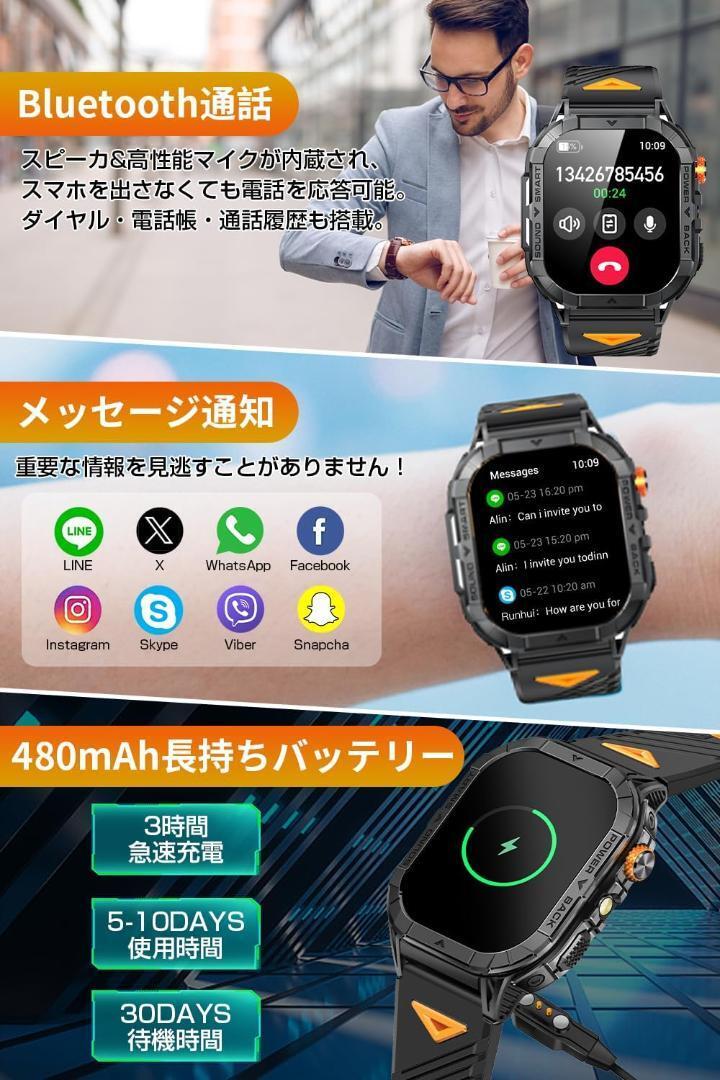 最先端のBluetooth 5.3を採用し、従来のスマートウォッチの通信問題を大幅に改善し、電池寿命、通信速度、通信範囲、接続の安定性も大幅に向上し、省エネ性も強化された。iPhoneおよびアンドロイドに対応しているスマートウォッチはスピーカー&高性能マイクを内蔵し、スマホを取り出さず装着したまま音声通話ができます。電話に出たり通話したり、連絡帳・履歴から電話をかけたりできます。革新的なスマートウォッチ メンズは、腕を上げるだけで、LINE、Twitter、Facebookなどのメッセージを読み取ったり、ハンズフリー通話(電話の応答・拒否)が可能です。