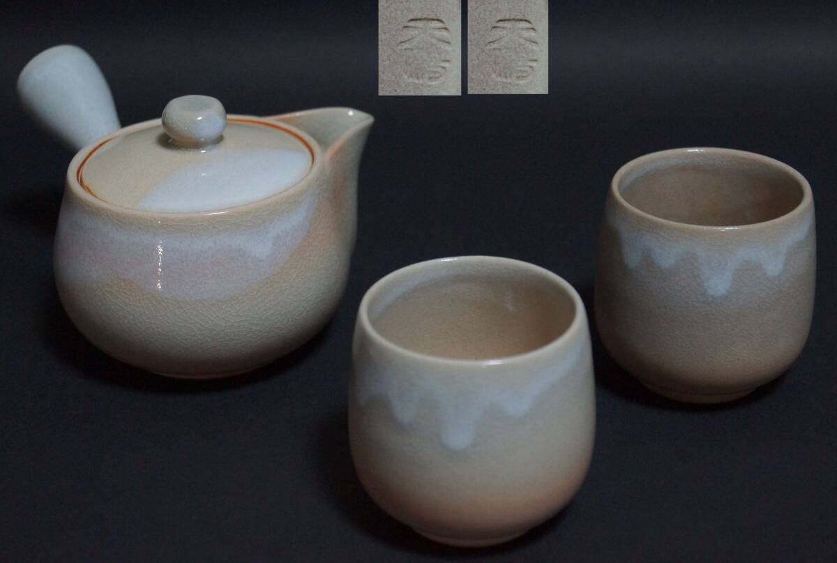 【寂】萩焼 丁鵬山造 急須 横手急須 / 湯呑 煎茶碗(2客) 煎茶道具 茶器セット 共箱 s70709