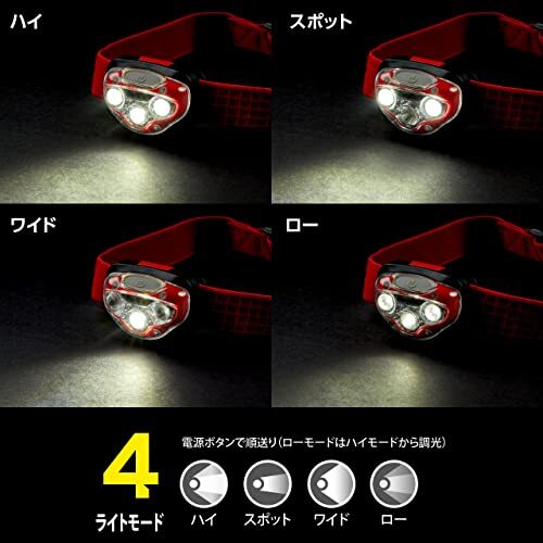 電池式・レッド 300lm HDB323・・Size:300lmStyle:電池式・明るさ最大300ルーメン・点灯最大時間35時間(ローモード使用時)・最大照射距離55メートル・IPX4対応防水・ハイ、ワイド、スポット、ローモードの切り替え選び抜かれた機能と明るさのミドルモデル ●明るさ最大300ルーメン(フルモード) ●照射時間:最大35時間、照射距離:最大55m ●ハイ、ワイド、スポット、ローモードの切り替え ●調光機能付き ●ヘッド部分は角度調整可能 ●全方向からの10分間の水しぶきに耐える全天候対応防水(IPX4) ●単4形アルカリ乾電池x3本使用(お試し用アルカリ乾電池付属) ●夜の散歩や登山・キャンプ時のパーソナルライトとしておススメ!キャンプなどでは街頭も少なく、スマートフォンのライトでは 足元を照らすには不十分