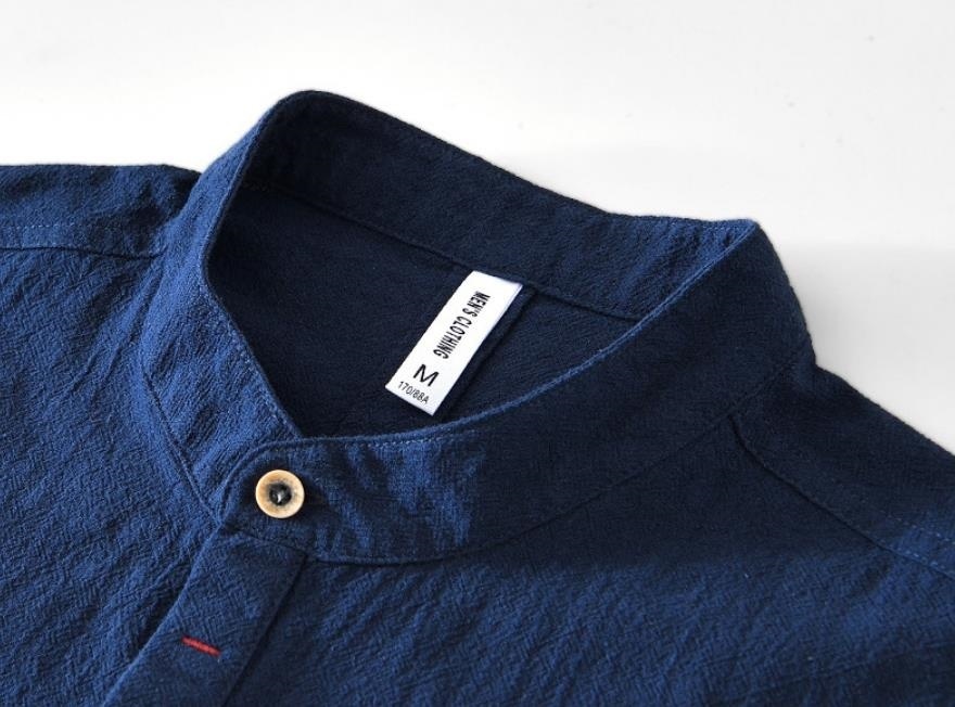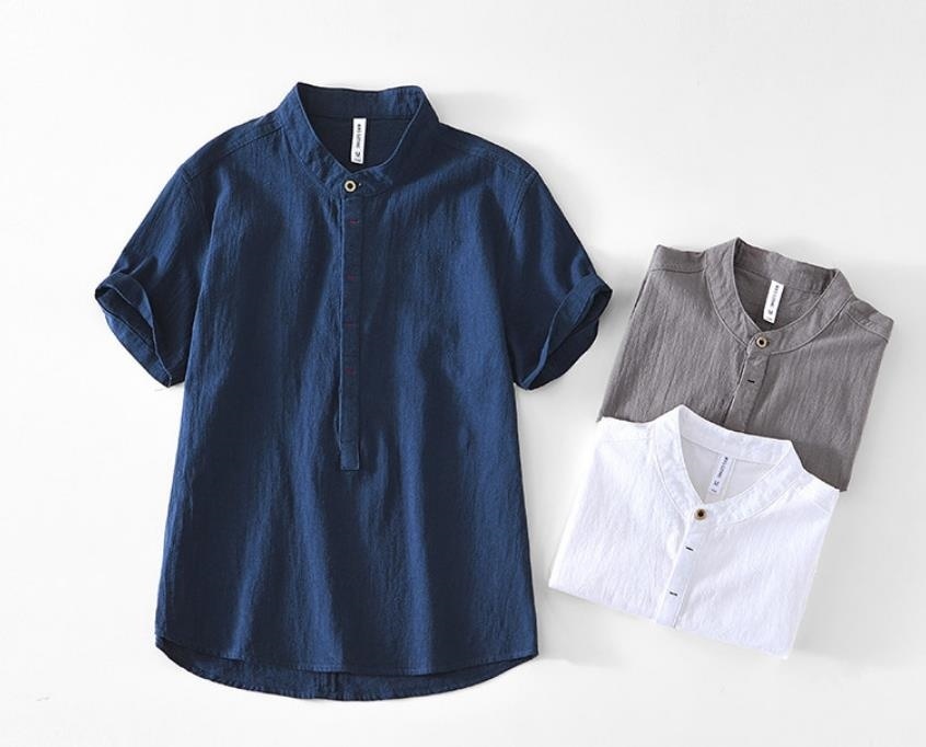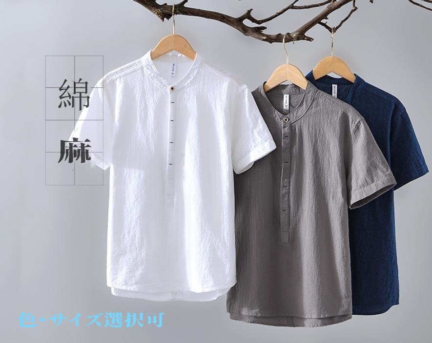 夏新品 リネンシャツ メンズ カジュアルシャツ 立ち襟 無地 半袖シャツ プルオーバー ヘンリーネック シンプル 夏服 トップス【L152】ネイビー 2XL