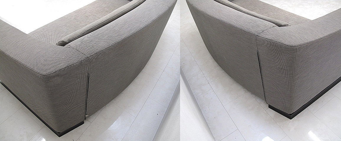 流麗な曲線を描く背もたれとアームが、まるで優しく抱きしめるかのように身体を包み込み、厚みのある高密度ポリウレタンフォームと上質なファブリック張地が比類なき快適性を実現しています。