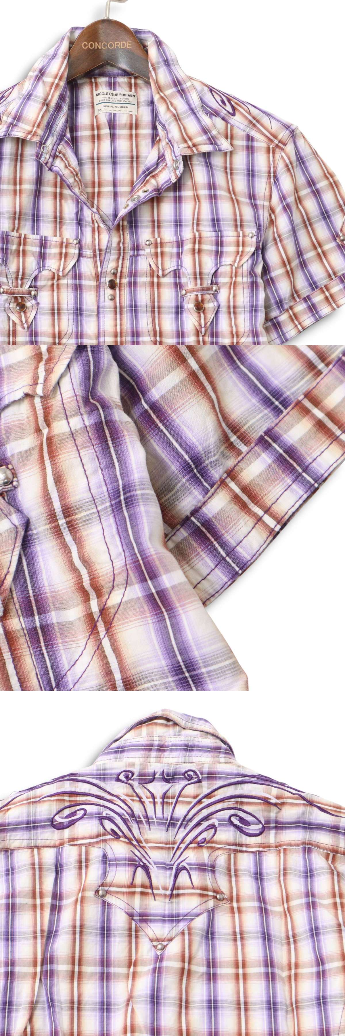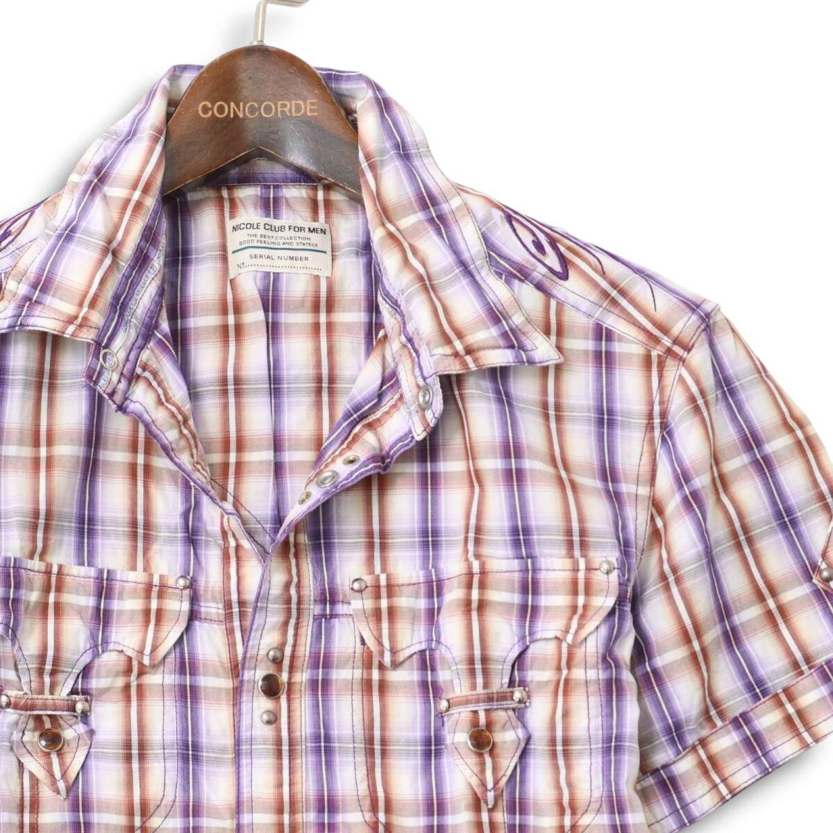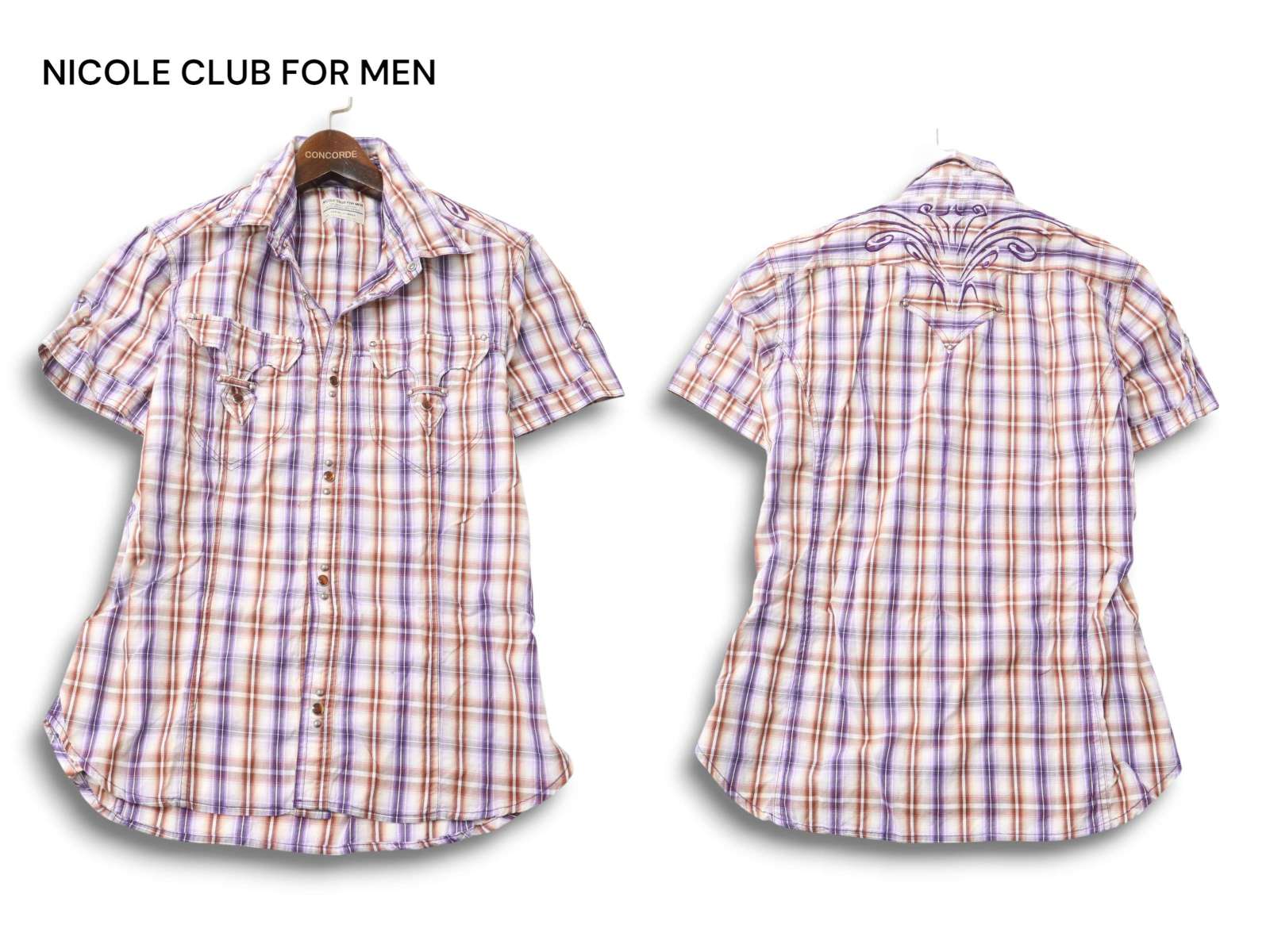 NICOLE CLUB FOR MEN ニコルクラブ フォーメン バック刺繍★ 半袖 ウエスタン チェック シャツ Sz.46 メンズ