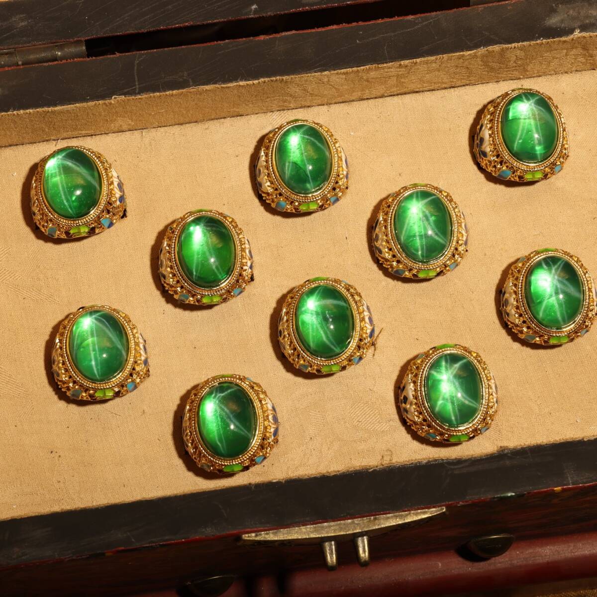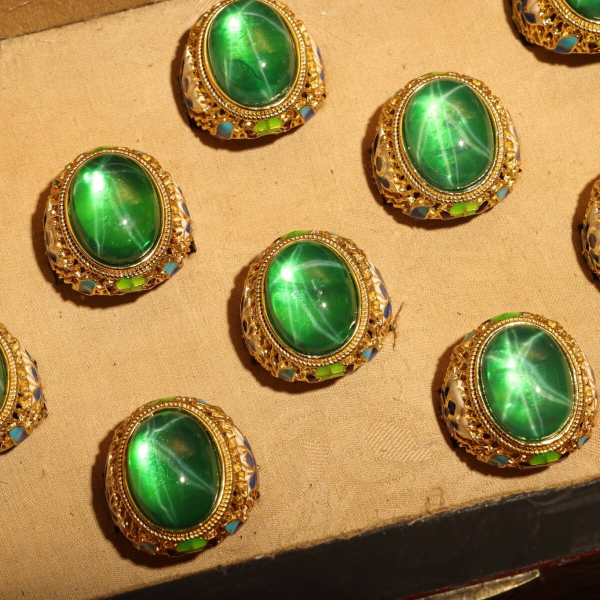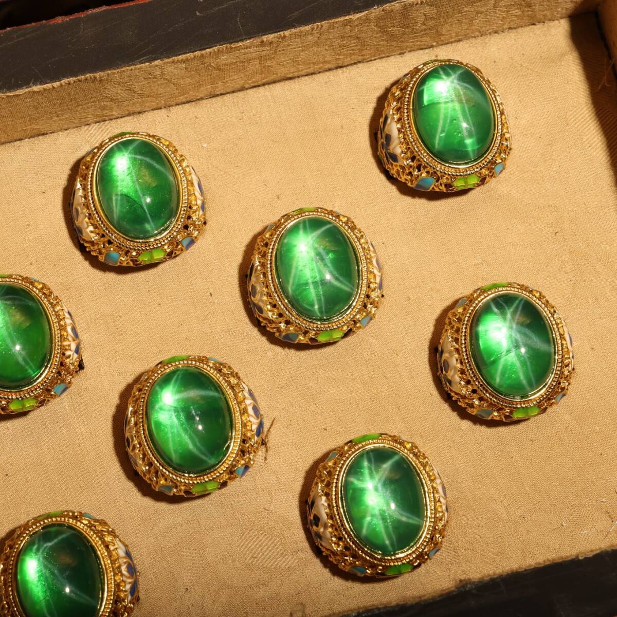 清時代 儲秀宮藏 古宝石彫 綠宝石 星光宝石 指輪 指環 戒指 首飾 一套 箱付 極細工 東洋彫刻 骨董品 中国唐物 古賞物 中国古玩 中国古美術