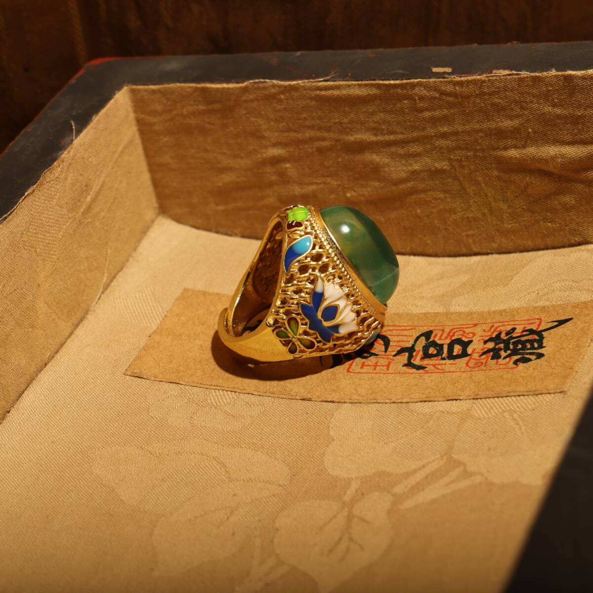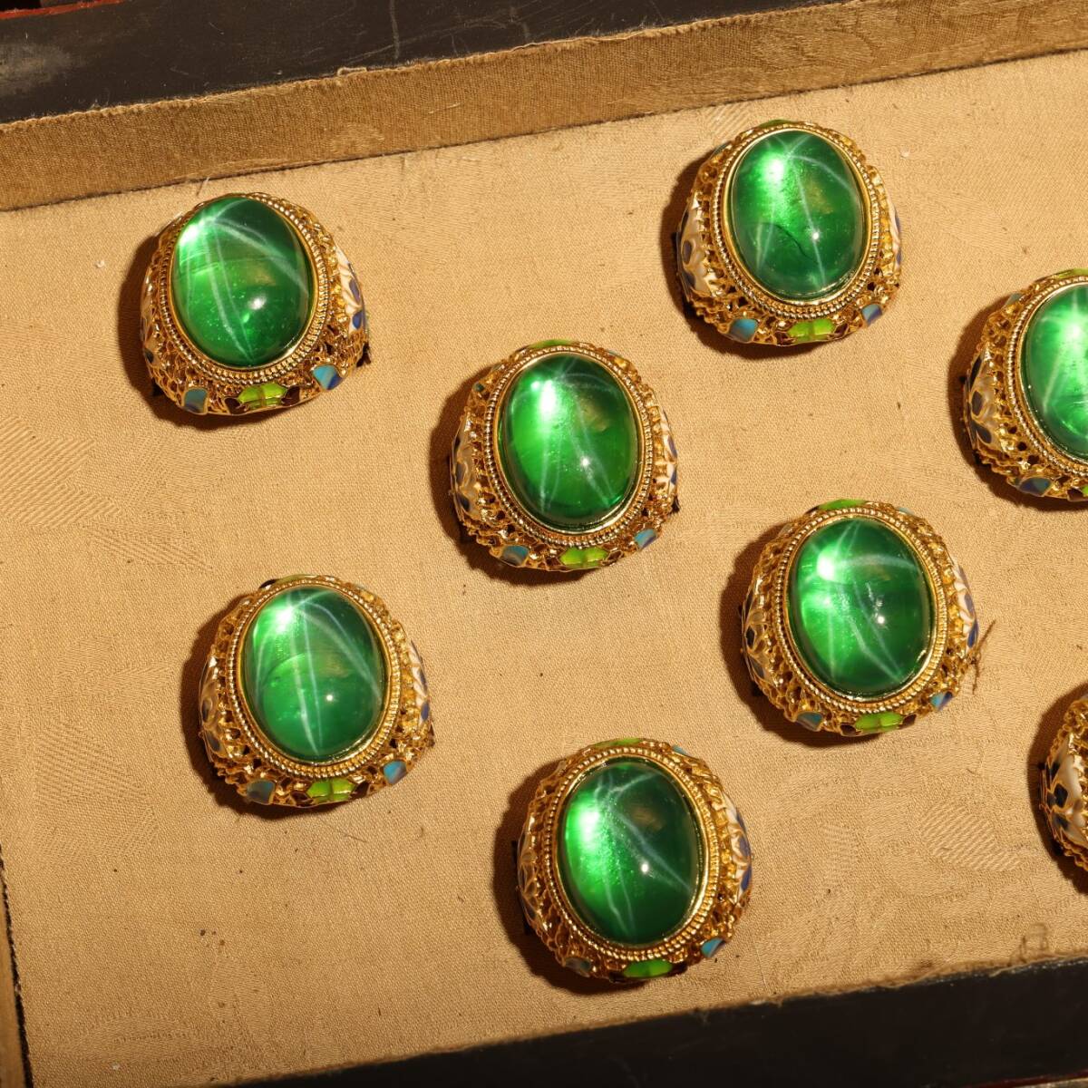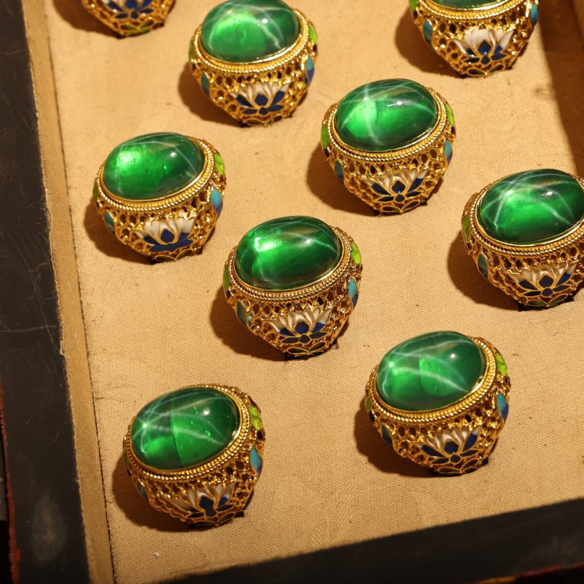 清時代 儲秀宮藏 古宝石彫 綠宝石 星光宝石 指輪 指環 戒指 首飾 一套 箱付 極細工 東洋彫刻 骨董品 中国唐物 古賞物 中国古玩 中国古美術