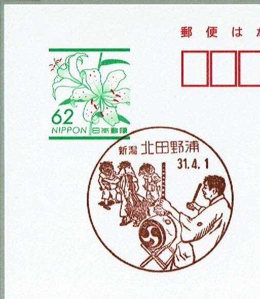 2019(平成31)年4月1日から使用開始された、風景印を官製はがきに使用開始の初日に押印。