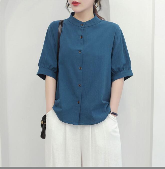 新作夏 重ね着 涼しい 半袖シャツ ブラウス レディース トップス 綿麻 ゆったり 無地 ファッション サイズ 2XL