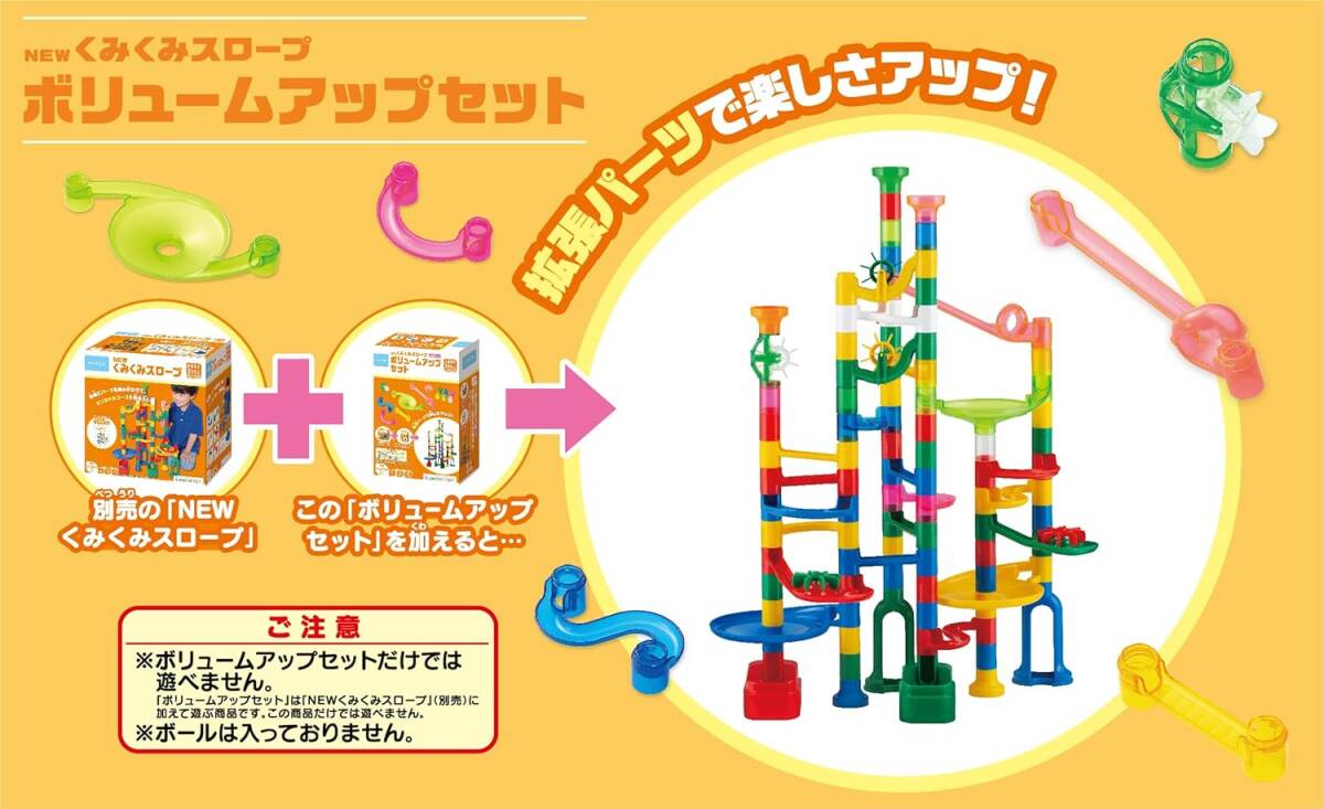 本商品は「NEWくみくみスロープ」(別売)に加えて遊ぶ商品です。「ボリュームアップセット」だけでは遊べません。また、ボールは入っておりません。