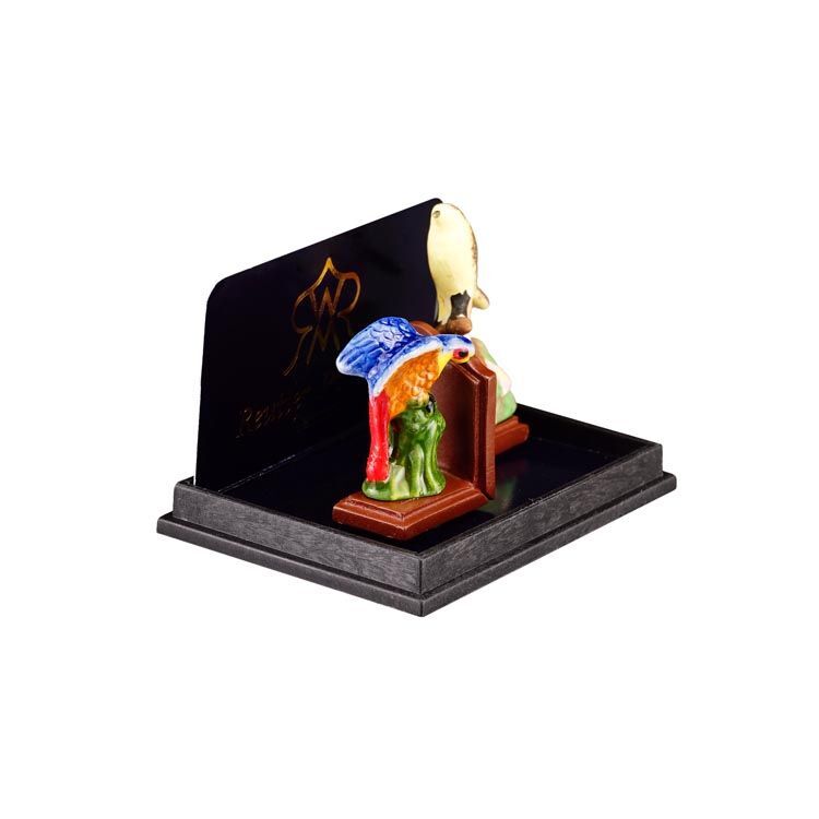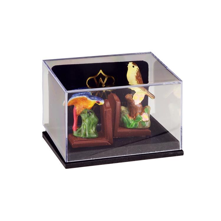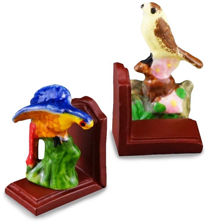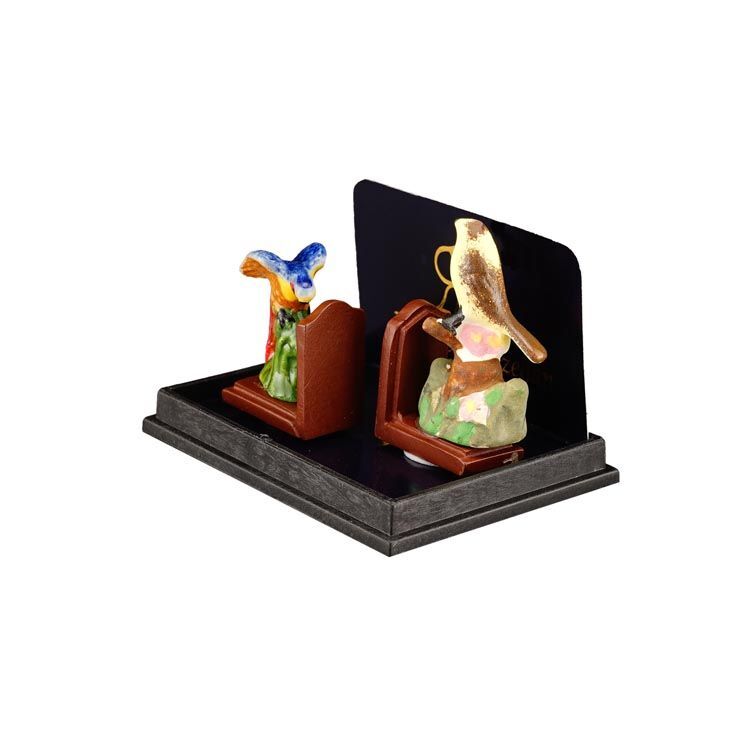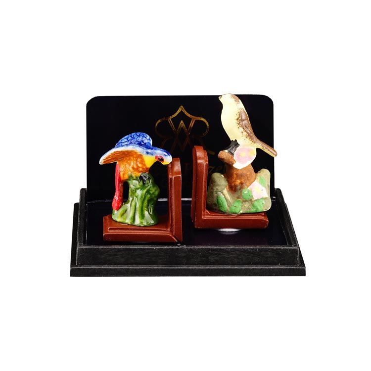 ドイツロイター社製のミニチュアです。なんとも躍動感のある、小鳥のブックエンドですね!日本人の控えめな感覚からは、容易に創造できそうもないルックスです。しかし、ドールハウスの中では存在感示してくれそうですよ!ぜひあなたのドールハウスに!小鳥は陶器製、ブックエンドは樹脂製です。サイズ:18x11xH32ミリ。スケールは1/12です。アクリルケース入りです。アクリルケースからは取り出せます。