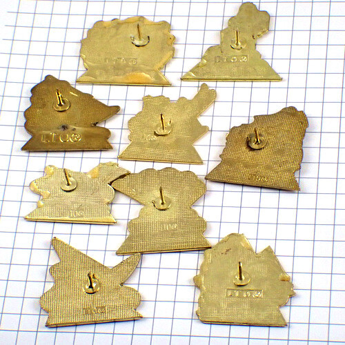 ピンズは、裏側に針が付いており、金属の留め金でとめるようになっています。 留め金が付属しています。新品の留め金も一緒に発送いたします。 | |
