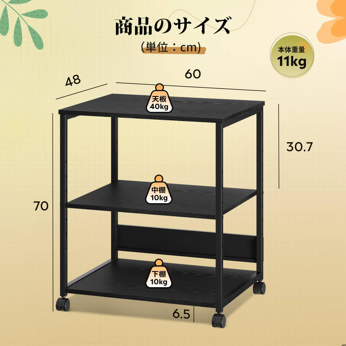 幅60×奥行48×高さ70cmのコンパクト設計ながら、総耐荷重70kgと頑丈な作りで、大型プリンターや