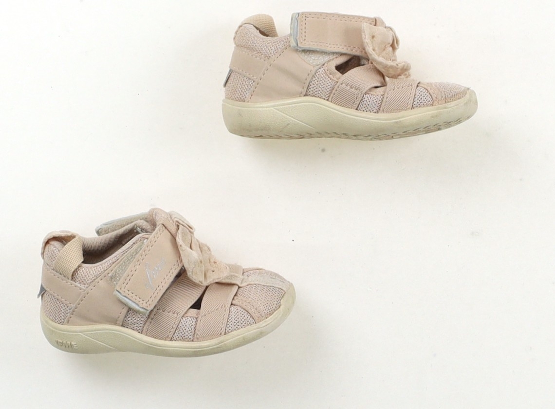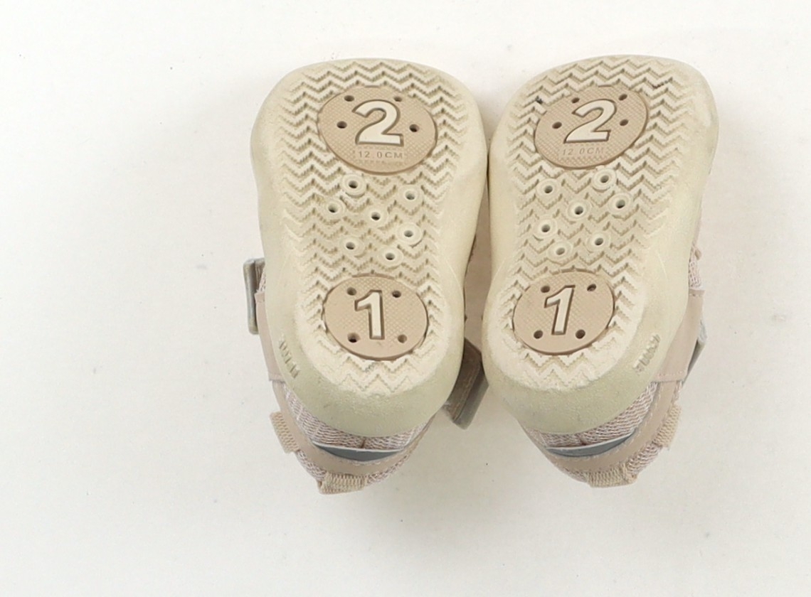 実際のサイズ表記は、12.0cm。水抜き穴付き。マジックテープ留め。ベルトのシルバー部分は褪せています。全体的に薄く汚れています。
