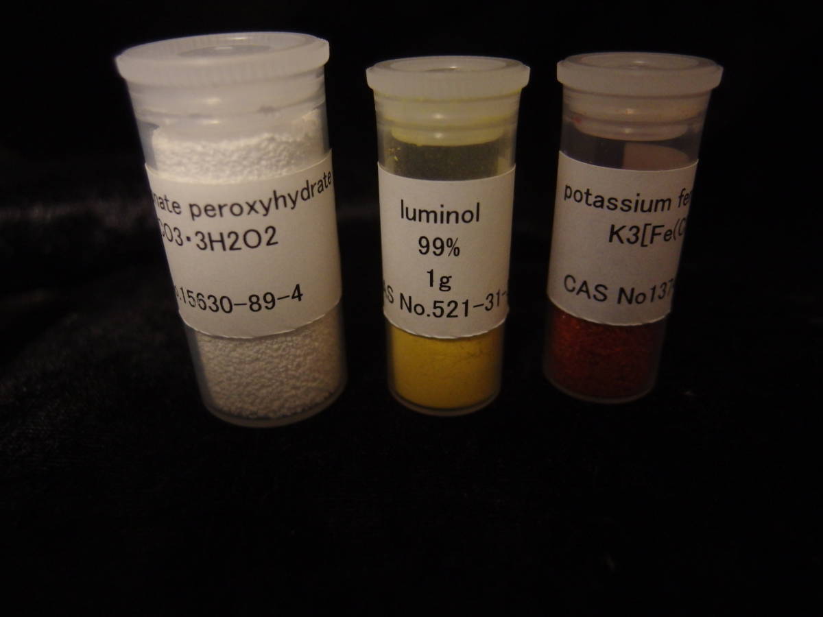 閲覧ありがとうございます。 ルミノール 99% 1g 、過炭酸ソーダ、フェリシアン化カリウム、3点でのセットでの販売です。 ルミノール自体は水に不溶ですがアルカリ性の条件では溶解します。 一般的は水酸化ナトリウムを用いて溶解させますが、洗濯用の漂白剤などにも用いられる取り扱いのより容易な過炭酸ソーダを添付させていただきます。 過炭酸ソーダを使うことで過酸化水素水も不要となります。 ルミノールを過炭酸ソーダの水溶液に溶解させて、別途フェリシアン化カリウムの水溶液を作っておき、両者を混ぜることで激しく発光します。 極めて微量の血痕でも鋭敏に反応するため、犯罪捜査などに用いられることがあります。 この反応は化学発光の代表的な例の1つです。 面白いので試してみたい方いかがでしょうか。 他にも何点か出品させていただいております。 よろしくお願いいたします。 ノークレーム・ノーリターンでお願いいたします。 |