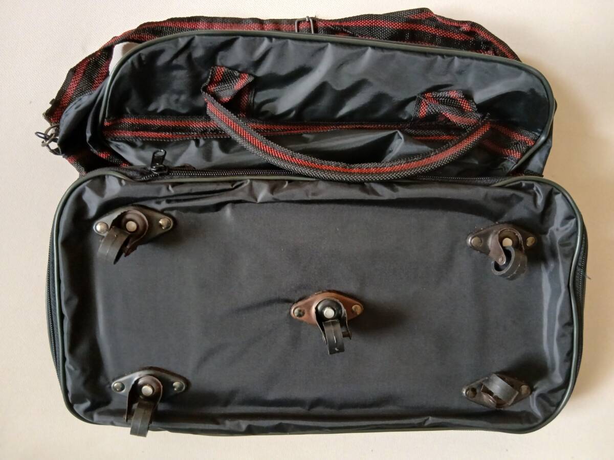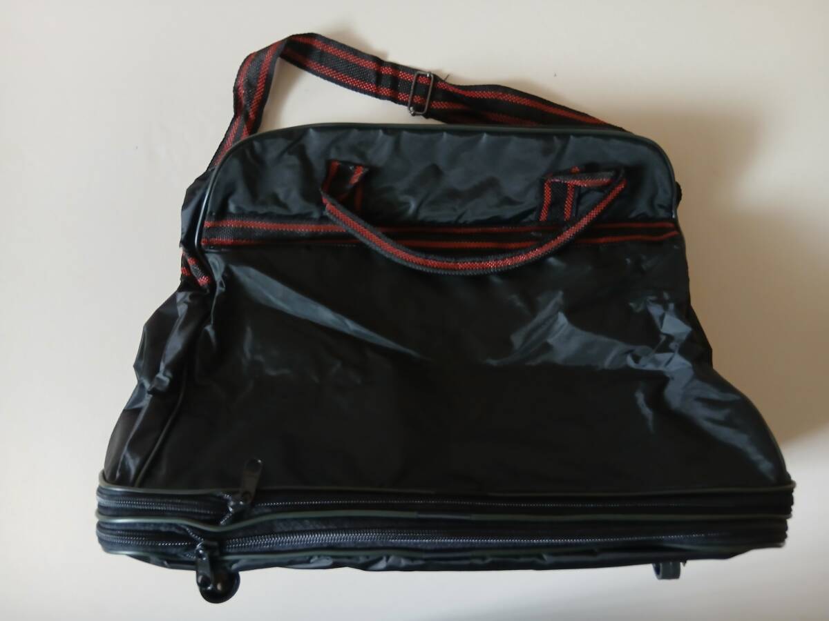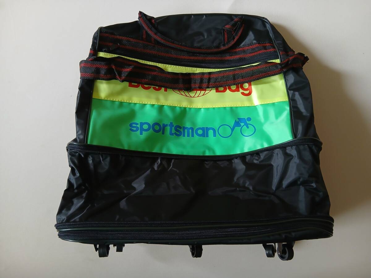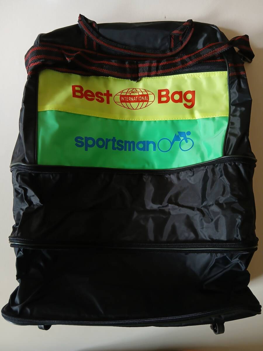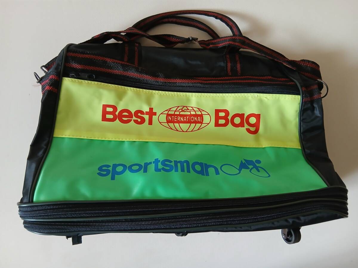 ★Best INTERNATIONAL Bag Sportsman です。20年ぐらい前に購入し、未使用のままビニル袋に入ったまま屋根裏部屋に眠っていました。バッグ底の付いているキャスターの金属部に錆がみられますが、その他内外とも汚れ等ありません。バッグ下部にファスナーが2カ所あり、それぞれのファスナーを開けると、2段階にバッグが伸びます。サイズは、チャックを2つとも閉めた状態で、H約33×42×20cm、ファスナーを一つ開けると、高さ約45cm、2つ開けると高さ約55cmです。
