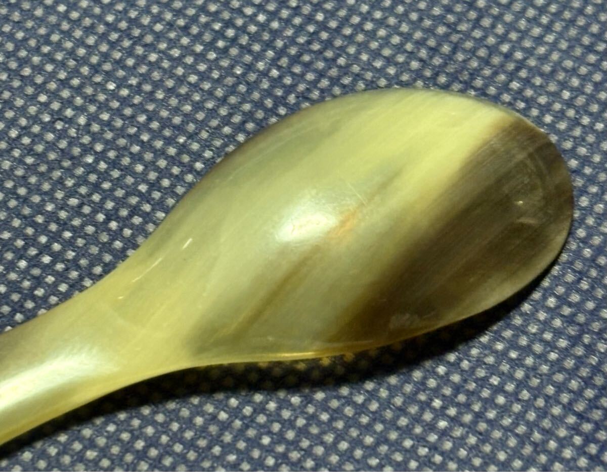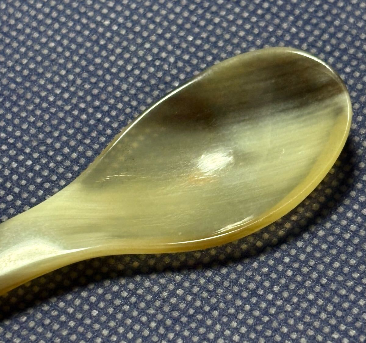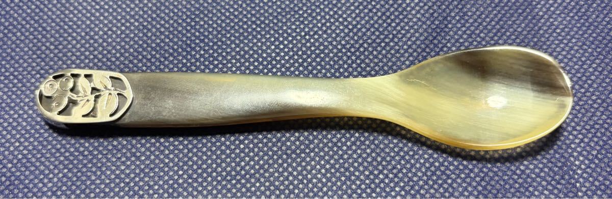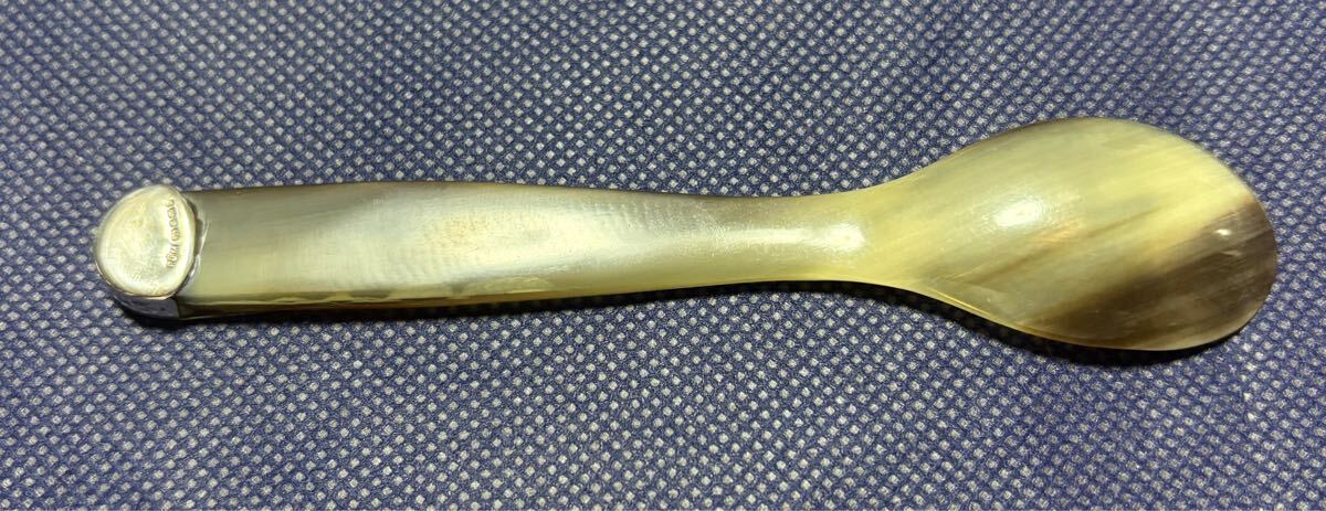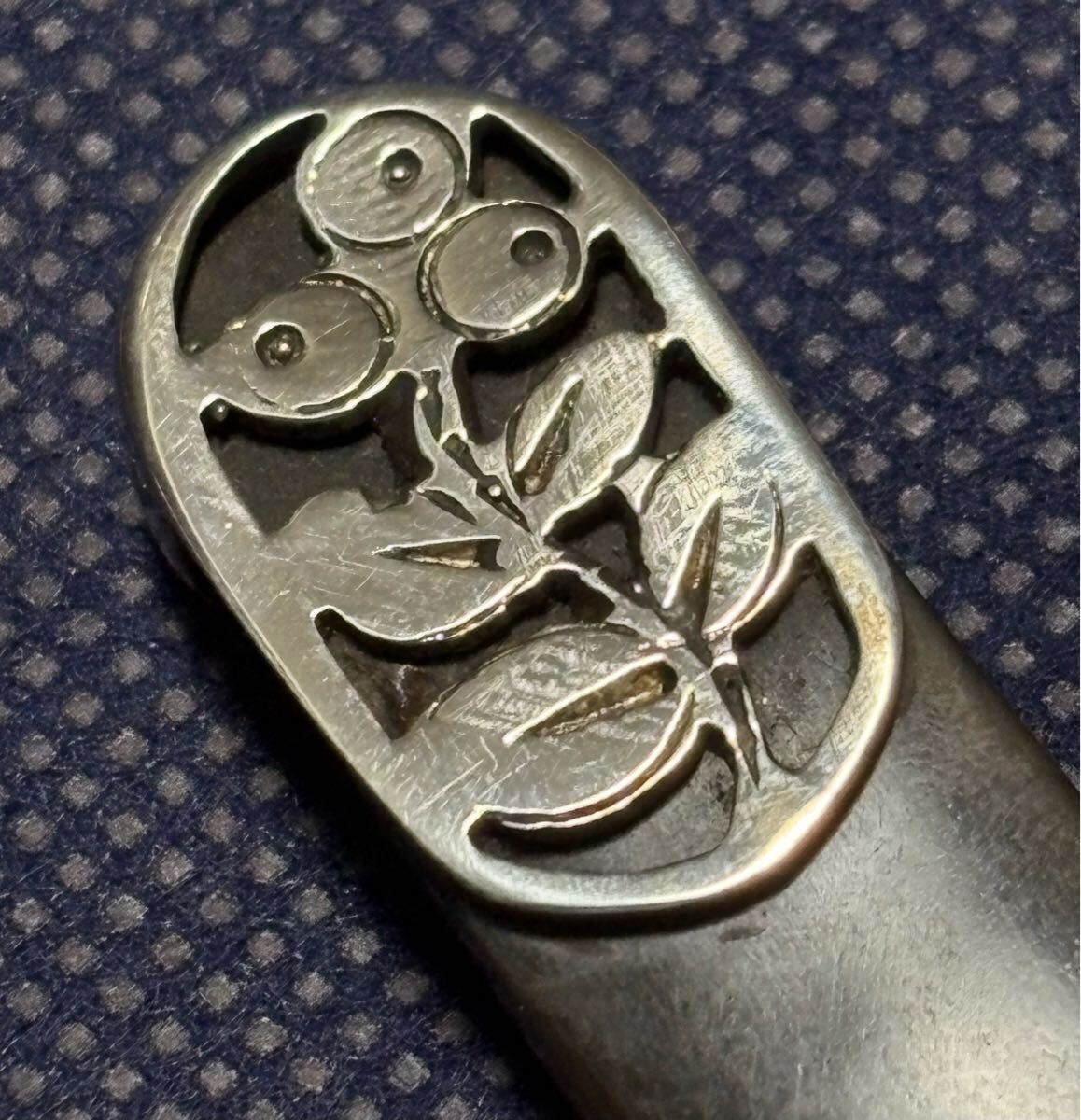 こちらは1976年、イギリス・シェフィールドの名門シルバースミス「PJM(Philip John Mortimer)」による作品です。持ち手部分は艶やかな天然ホーン(牛角)製で、エンドにはスターリングシルバー(925刻印)が贅沢に使われています。花の透かし模様があしらわれたデザインは、エレガンスかつ珍しさがあり、コレクターにも人気です。