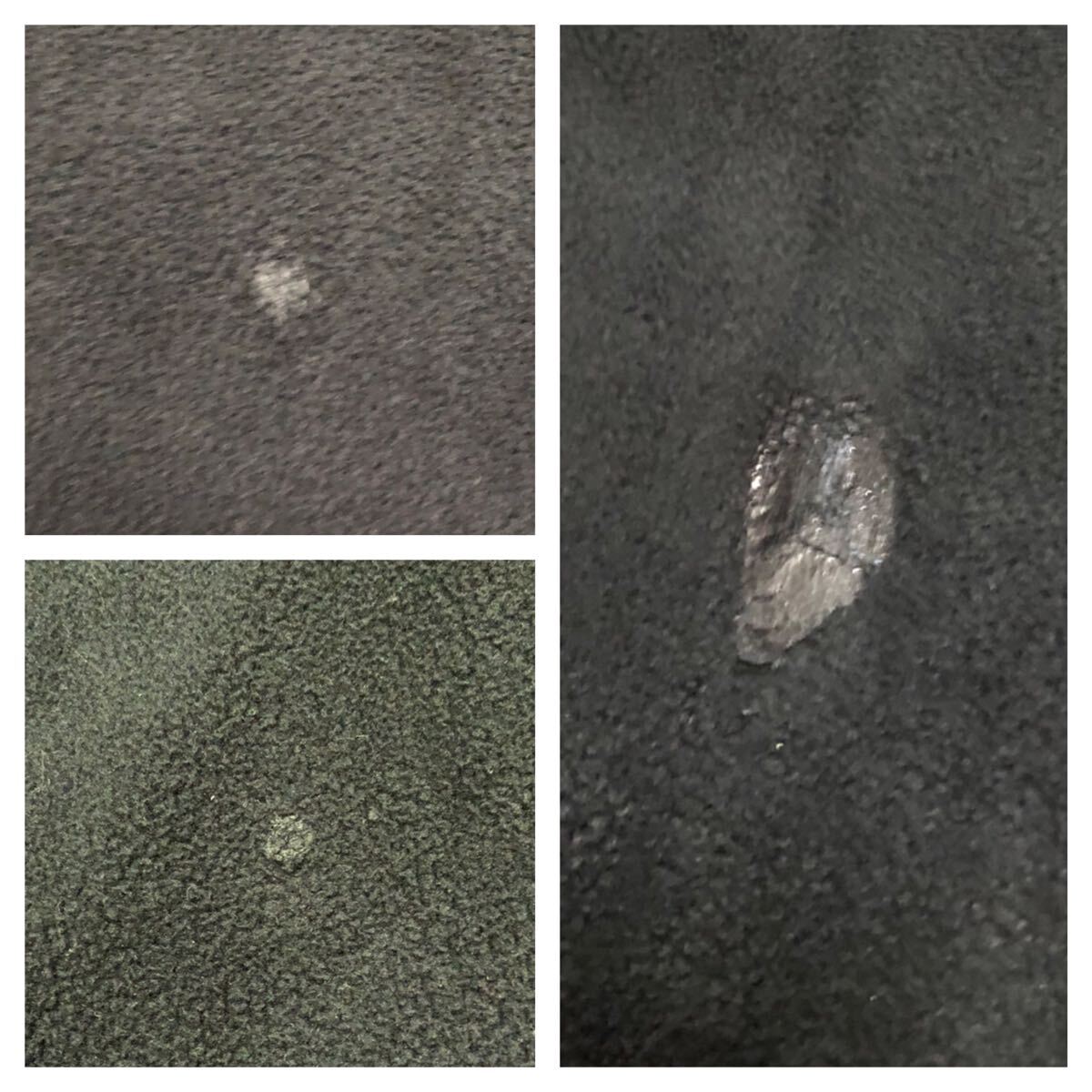 少し毛羽立ち、少し色落ちがあります。右膝に一部溶けたようなダメージ、左膝に少しスレがあります。