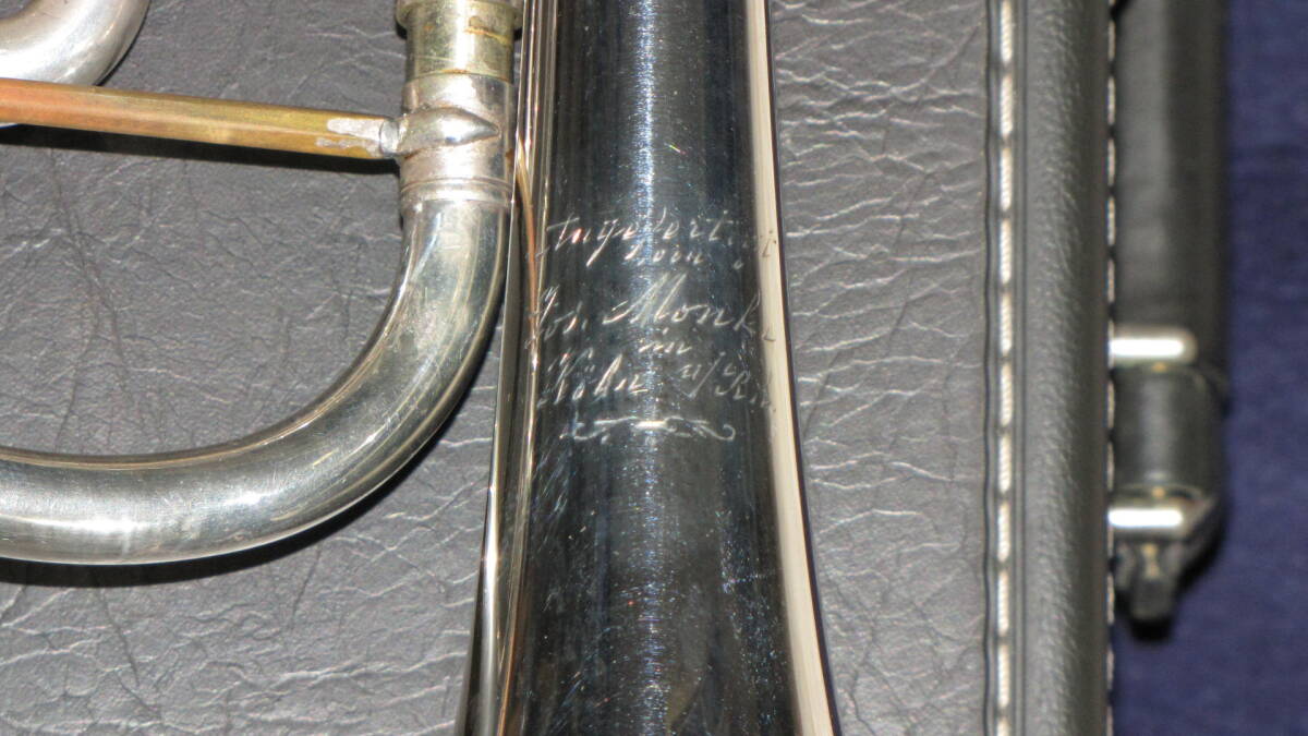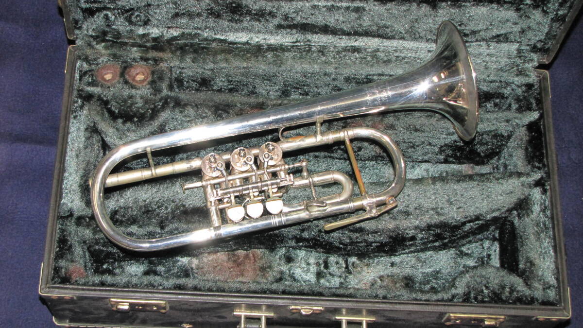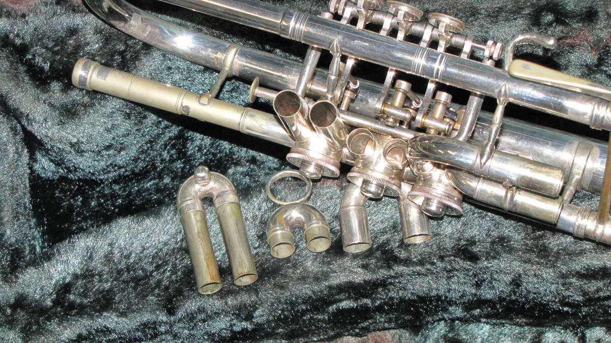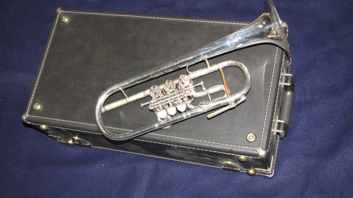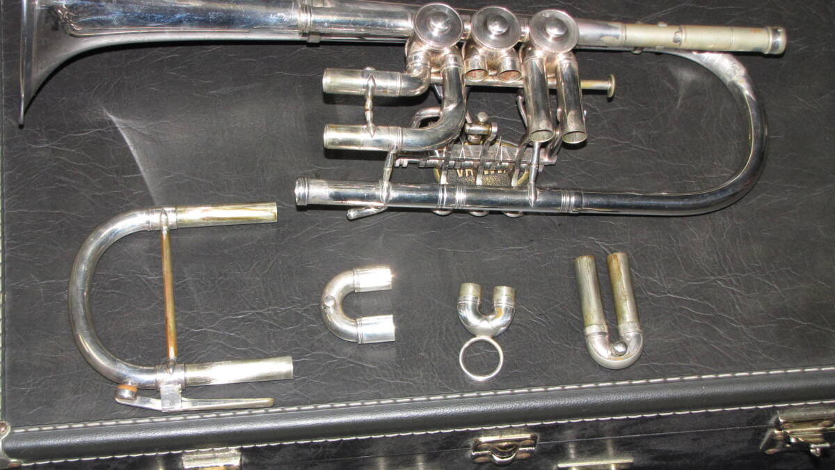 J.モンケのC管ロータリーランペット の中古です。銀メッキ、いろいろ改造されています。・ベルクランツが外されています ・主管に支柱が追加されています ・右手小指用フィンガーフックが増設されています ・その他支柱の位置が変更されています   元はプロ奏者使用品らしいですが、こだわり満載だと思います。吹奏感等は好みや主観もあるので控えます。 メッキはところどころ剥げがありますが、普通に使えそうです。可動部は全て動きロータリー・スライド類も快調です。