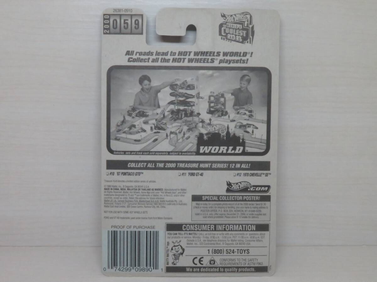 ホットウィールの小スケール(トミカサイズ)のミニカーで、2000年のTREASURE HUNT1台です。新品で購入以来、ブリスター未開封で暗所保管しておりましたので、ミニカー自体は基本的に美品ですが、個体差、塗装ムラなど量産品レベルをご理解いただける方のみ入札してください。また、ミニカー特有の経年劣化(塗装の浮き、荒れ等)がある場合もありますので、状態に不安を抱く方は入札されない方が無難です。状態は目視でチェックしていますが、万一、不良、欠品があっても返品、アフターフォローは一切お受けしませんので、そういうリスクを承知いただける方のみ入札してください。ブリスター、台紙は経年で変色、スレ、折れ、ヘコミなどがありますので、状態を気にする方は入札をご遠慮ください。