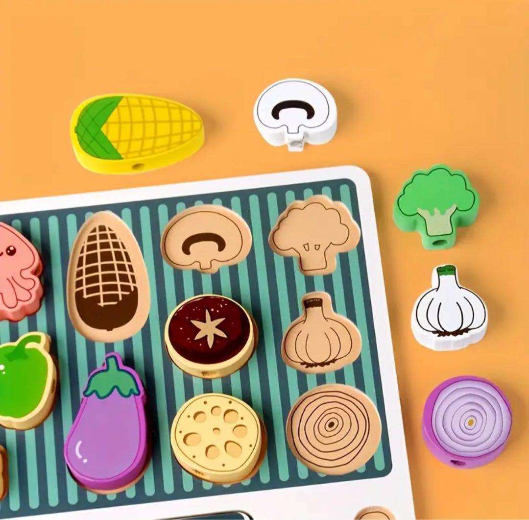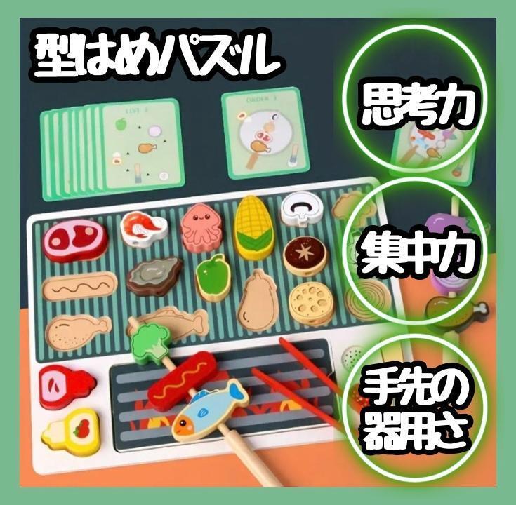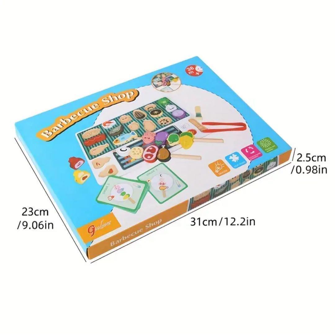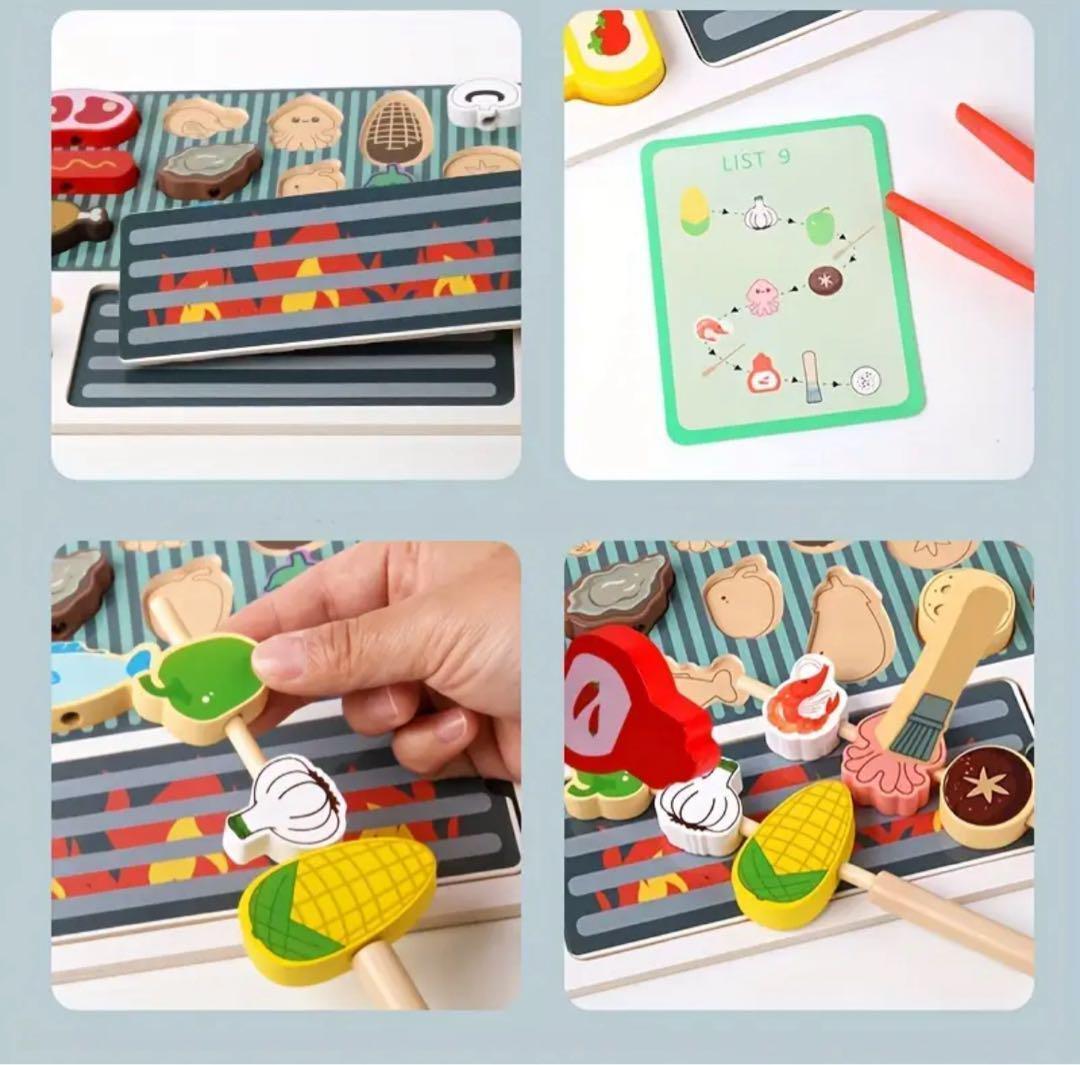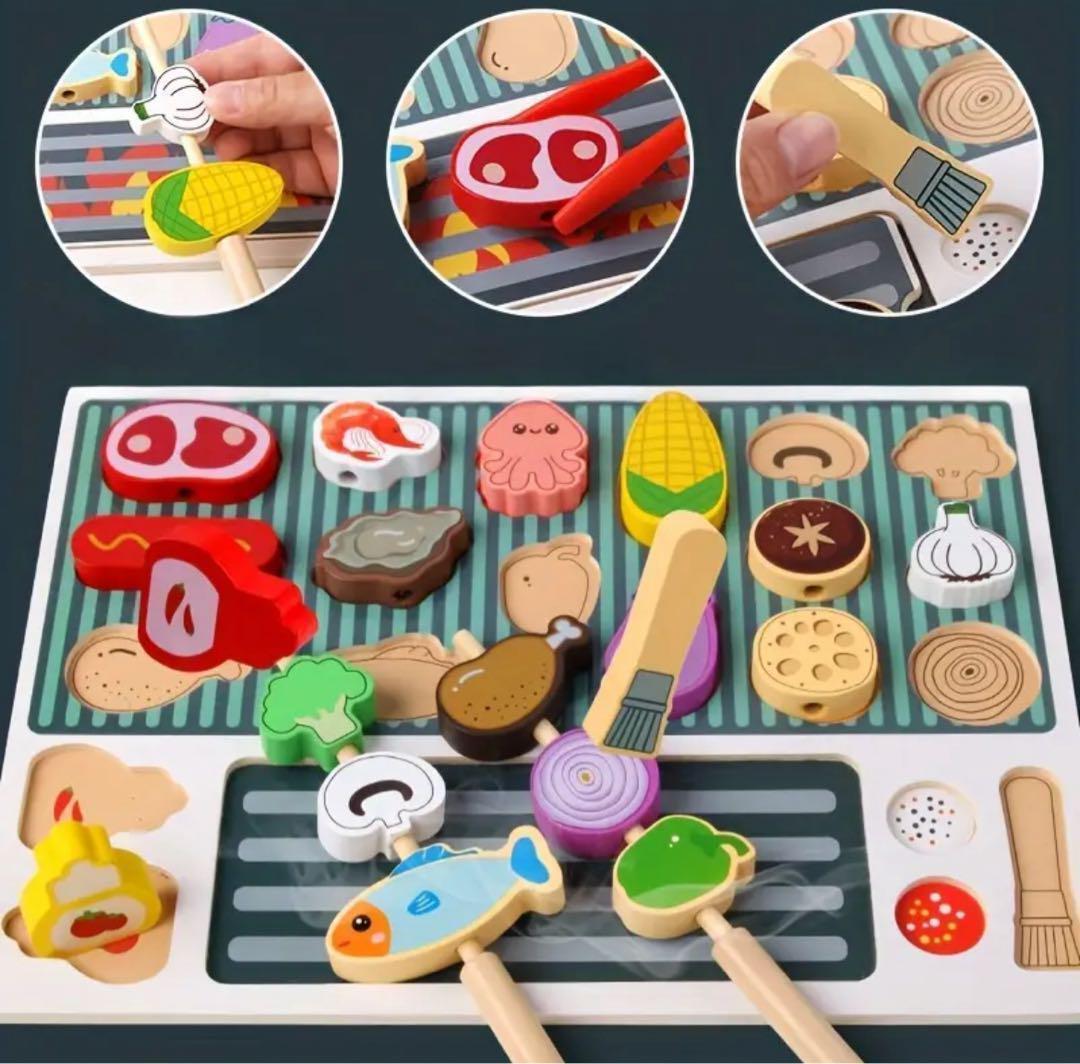 バーベキューごっこで型はめ遊び、棒通し・紐通しで指先の器用さを育て、クリップで掴む遊びも楽しめます♪