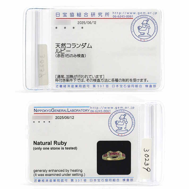 ソーティング記載 | 天然コランダム ルビー (赤色1石のみ検査) 通常、加熱が行われています |