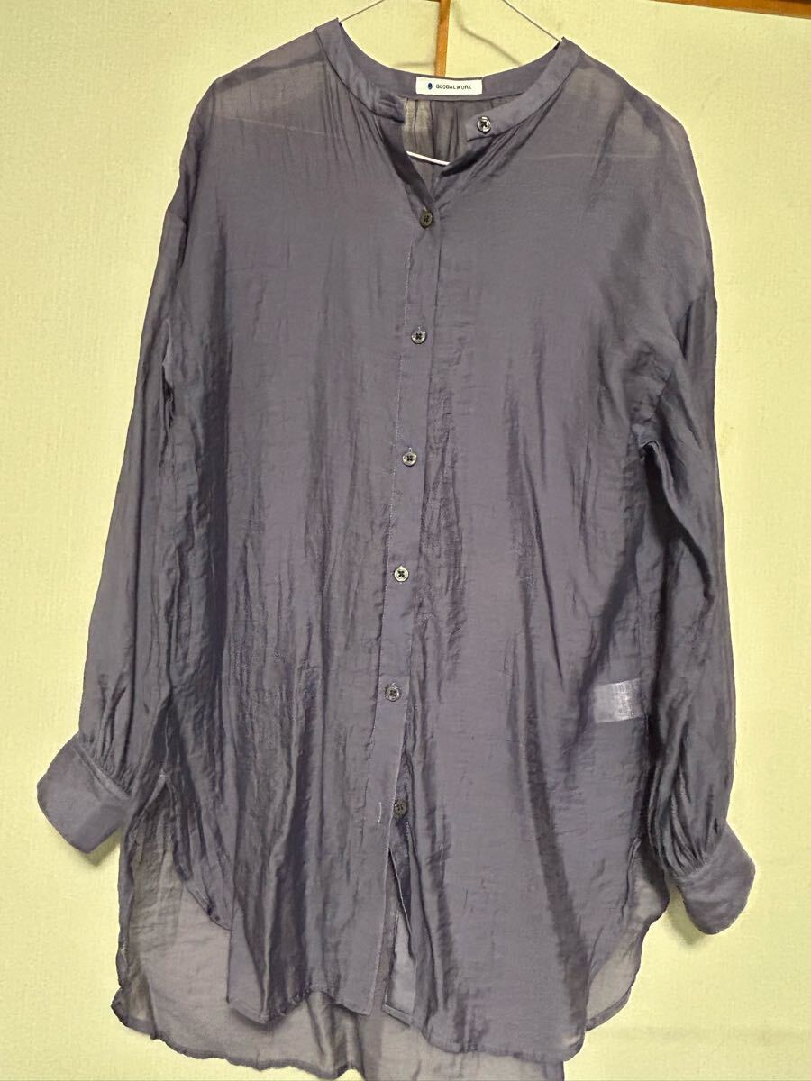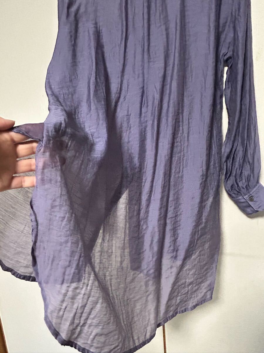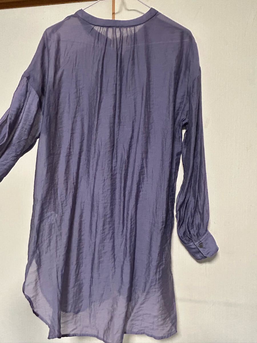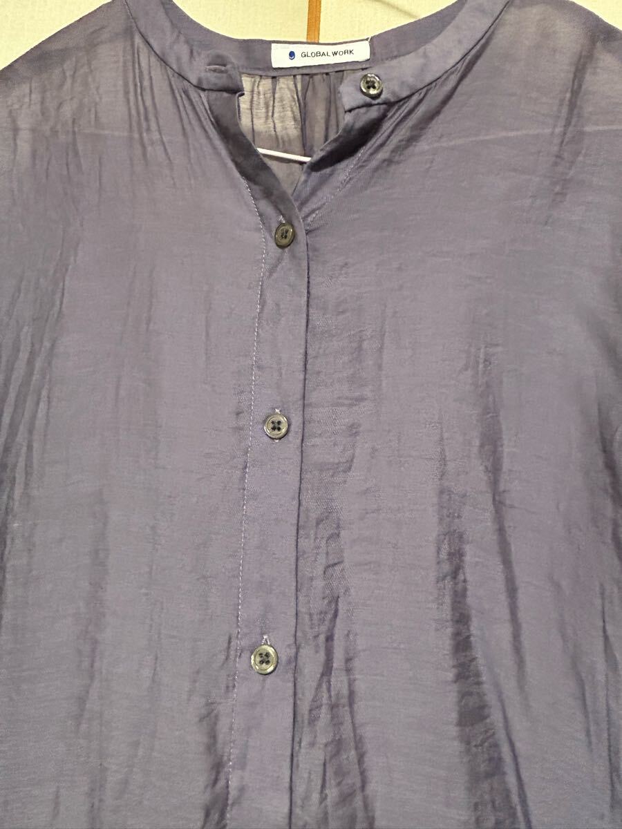 軽量素材のパープル長袖シャツ、ボタン付きのバンドカラー。