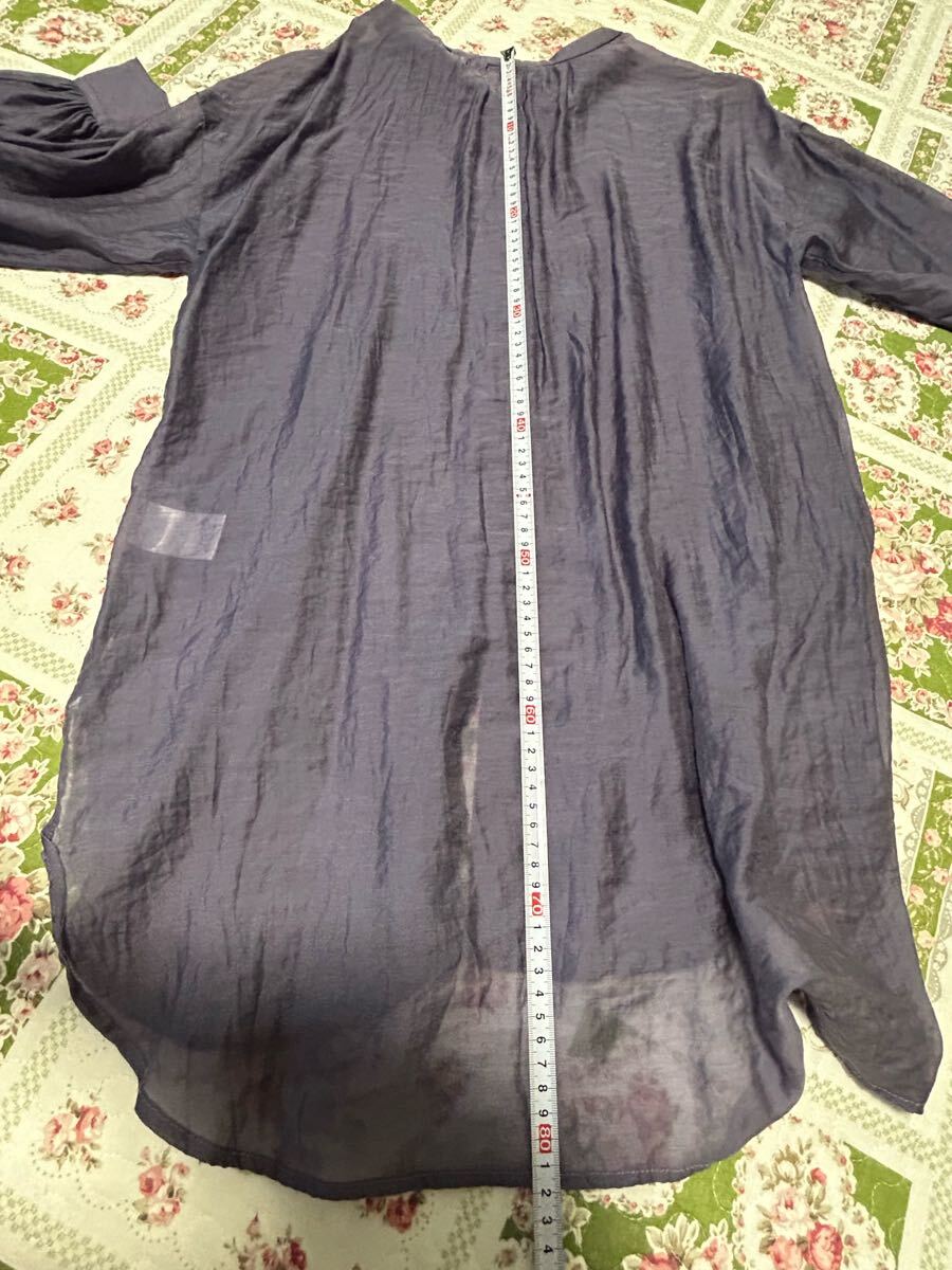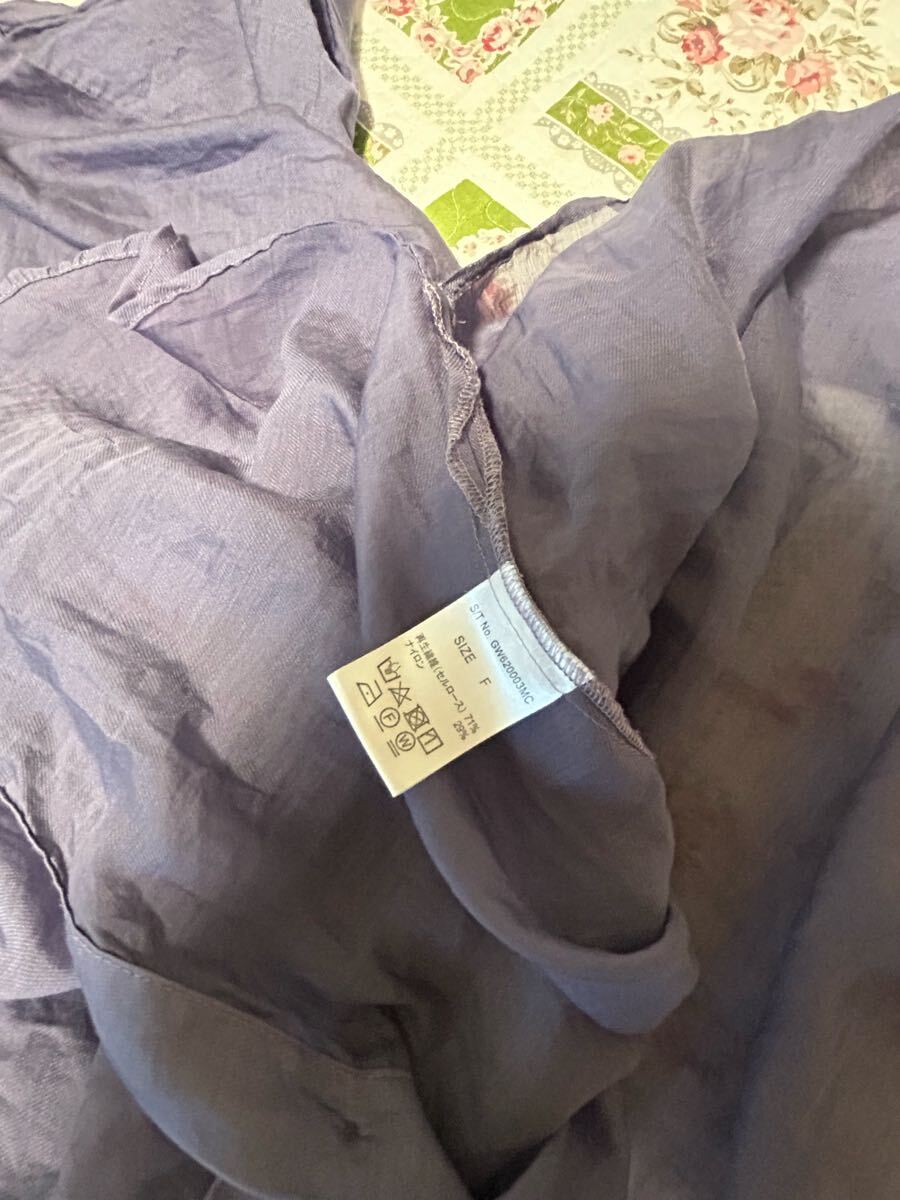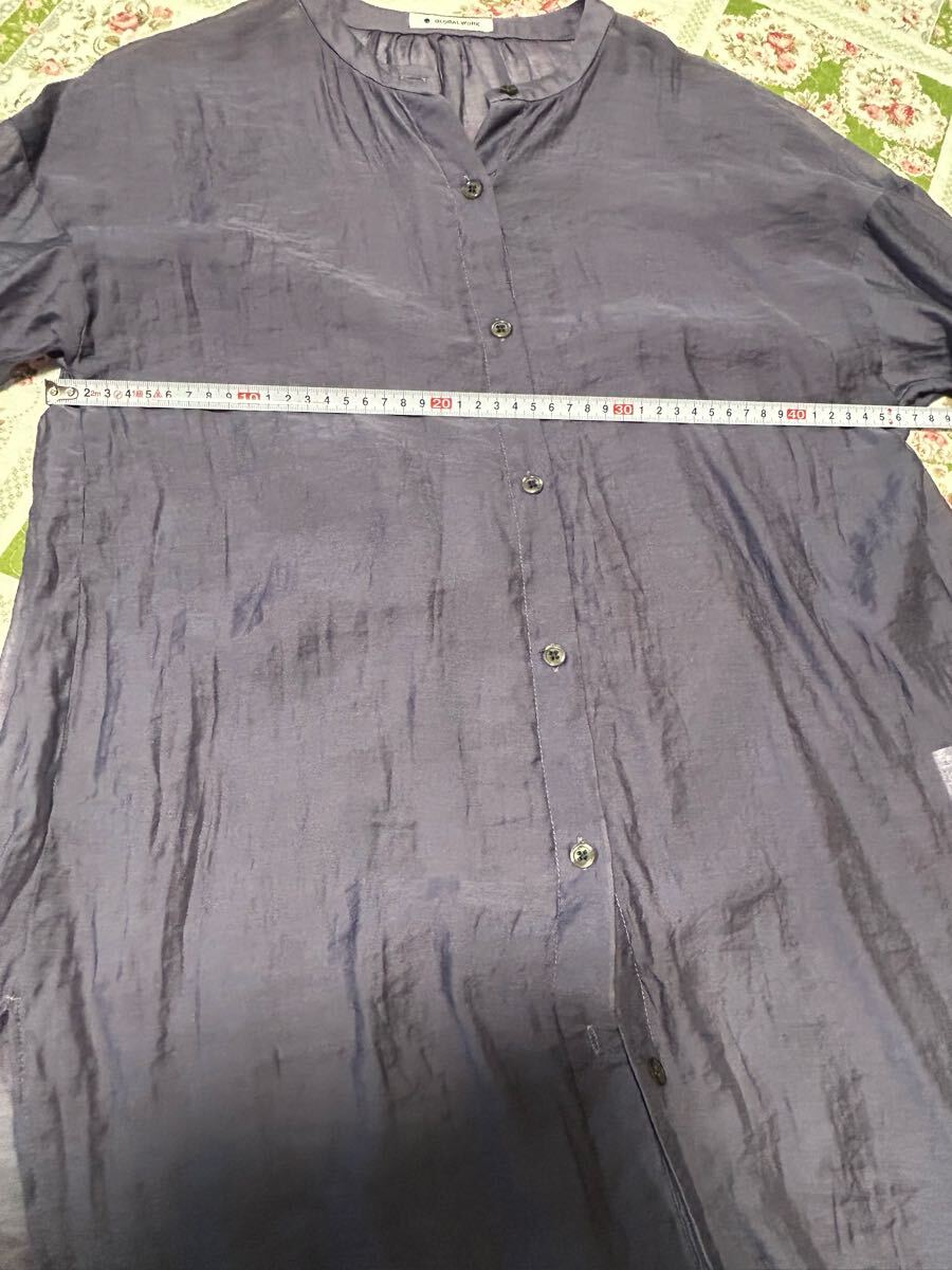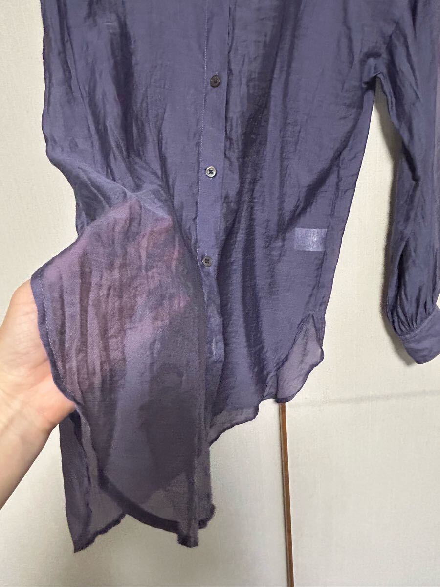 軽量素材のパープル長袖シャツ、ボタン付きのバンドカラー。
