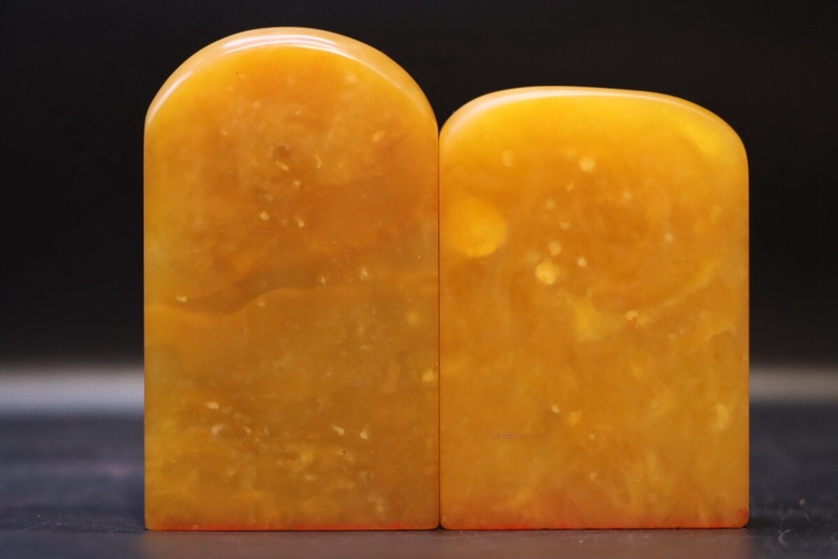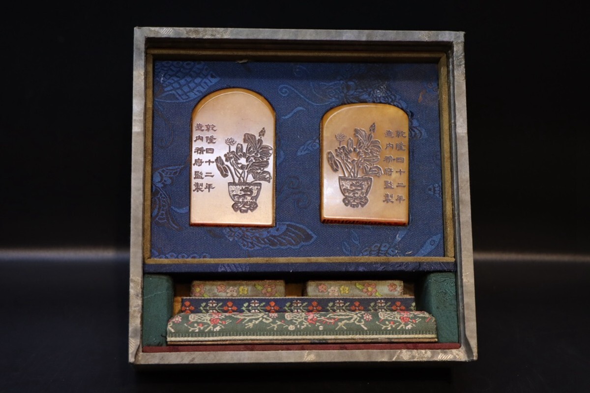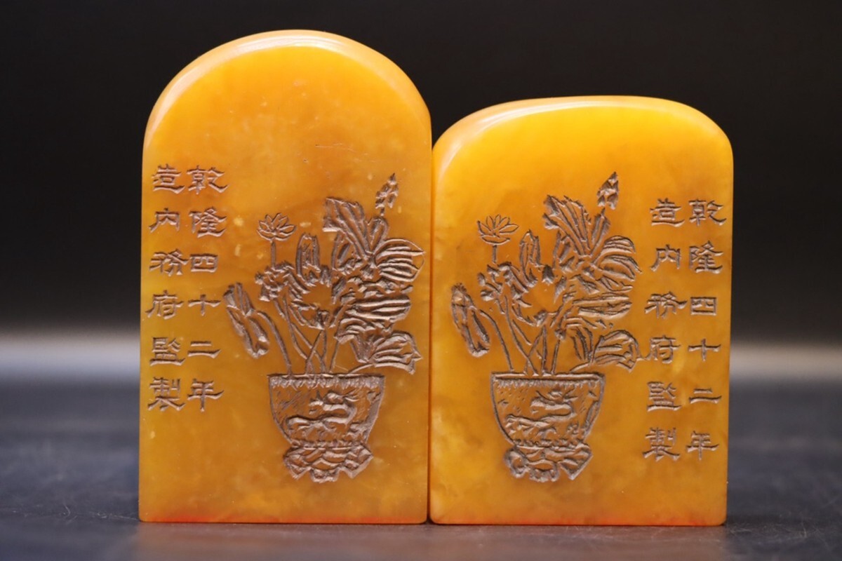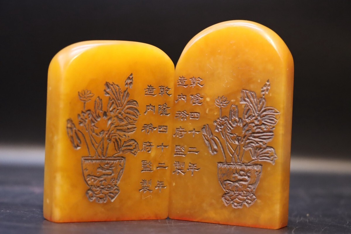 【瓏】寿山石 田黄石彫 盆景 対章 清代 乾隆四十二年造内務府監製 極細工 手彫り 置物擺件 中国古賞物 古美術 蔵出