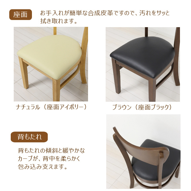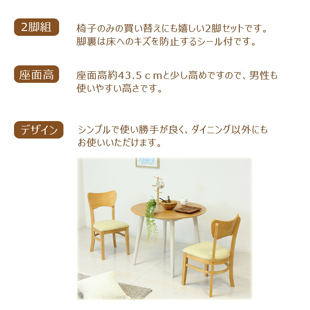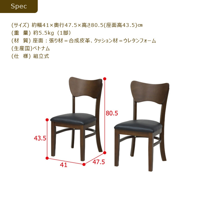 商品説明 | フェブラ ダイニングチェア 2脚組 ブラウン(BR) 落札後、最初の連絡で配達伝票に記載する電話番号をお尋ねします シンプルなデザインのダイニングチェアです。 ●背もたれの傾斜と緩やかなカーブが、背中を柔らかく包み込み支えます。 ●脚裏は床へのキズを防止するシール付です。 ●座面は、お手入れが簡単な合成皮革ですので、汚れをサッと拭き取れます。 ●2脚セットになります。 ※テーブルは別売りになっております。 サイズ・容量 【商品サイズ】約 幅41×奥行47.5×高さ80.5(座面高43.5)cm 【重 量】約 5.5kg(1脚) 【梱包サイズ】約 87×43×27cm(約157cm) 【梱包重量】約 12.5kg 規格 【材 質】構造部材=天然木、ラッカー塗装、座面:張り材=合成皮革、クッション材=ウレタンフォーム 【仕 様】組立式 【生産国】ベトナム ブラウン(BR)専用ページです、ナチュラル(NA)も有りますが別ベージとなってます。 (1枚目の写真は取扱いカラー全色を載せていますが、専用ページカラー以外の画像は参考として下さい サイズの写真はブラウンを使っていますが、画像は参考として下さい) カタログ価格20000円 |