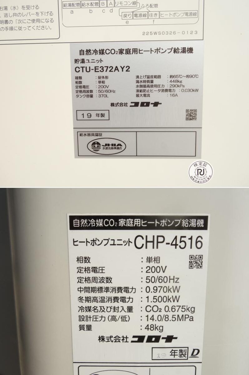 【中古】M▽コロナ 給湯器 自然冷媒CO2 家庭用 ヒートポンプ エコキュート 2缶式 フルオート リモコン 単相200V CEP-E372AY2 (38650)