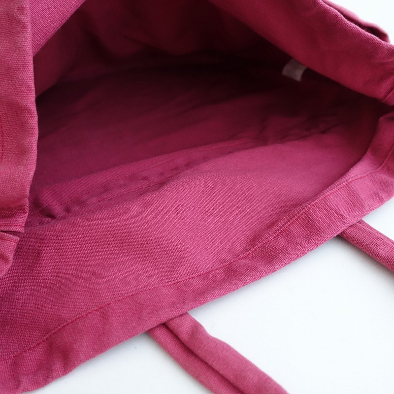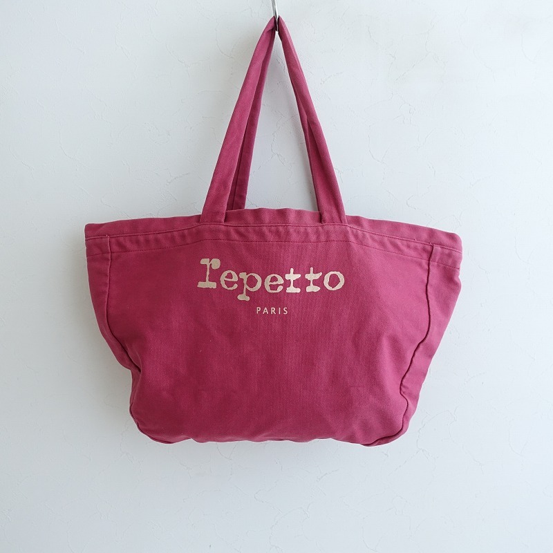 | repettoのキャンバストートバッグです。カラーは赤紫で、綿キャンバス地であしらわれており、前面にロゴがプリントされています。開口部は巾着仕様です。 |