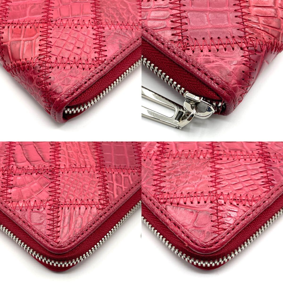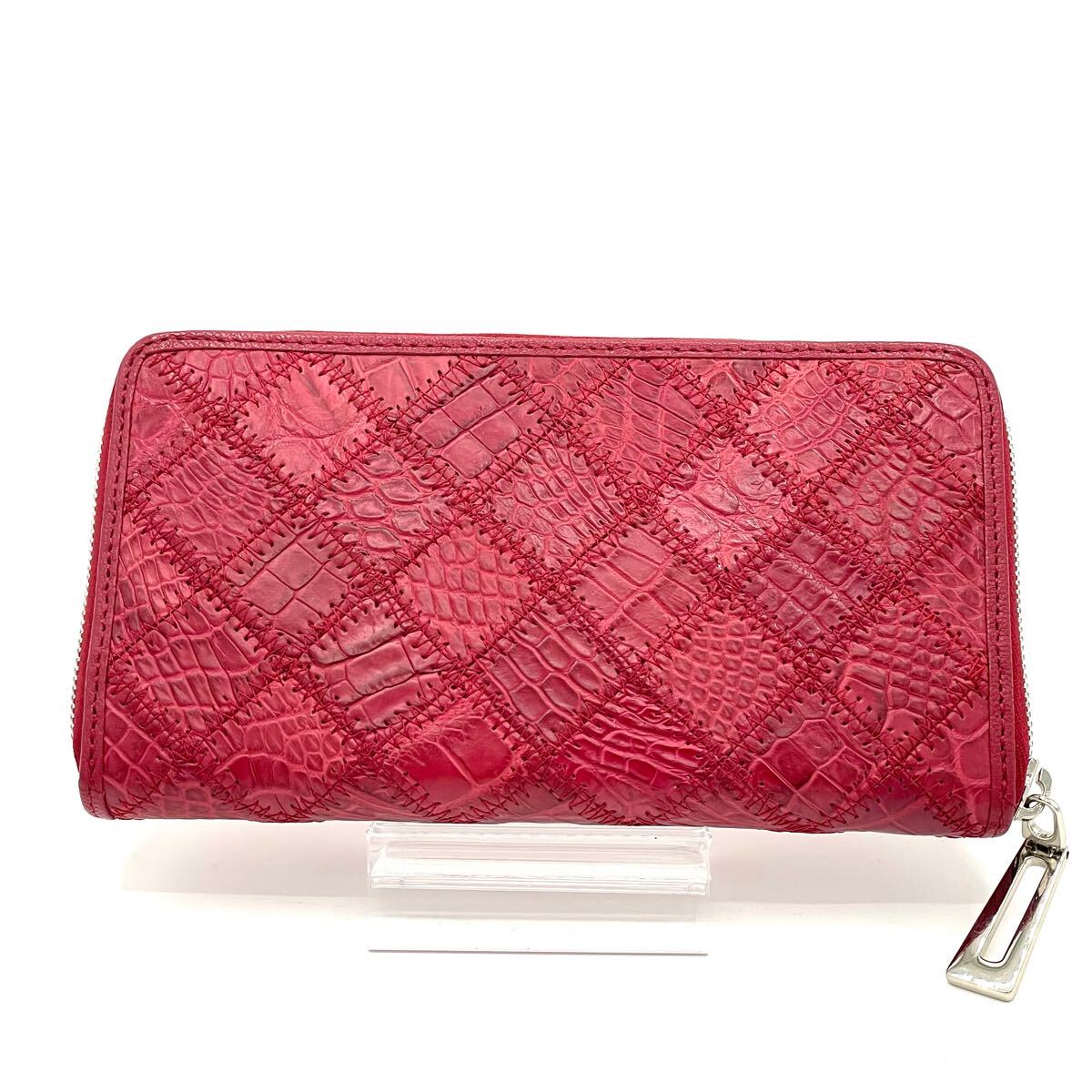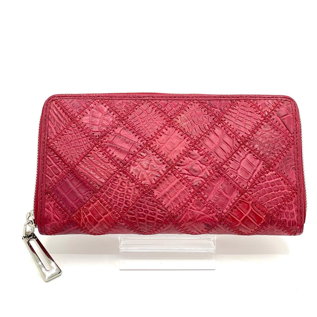 CROCODILE 美品 クロコダイル パッチワーク 長財布 ラウンドファスナー クロコ エキゾチックレザー ワニ革 鰐 レッド 赤 レディース 1973