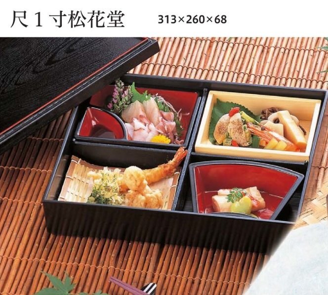 業務用漆器ABS樹脂仕切付の尺1寸木目松花堂です。