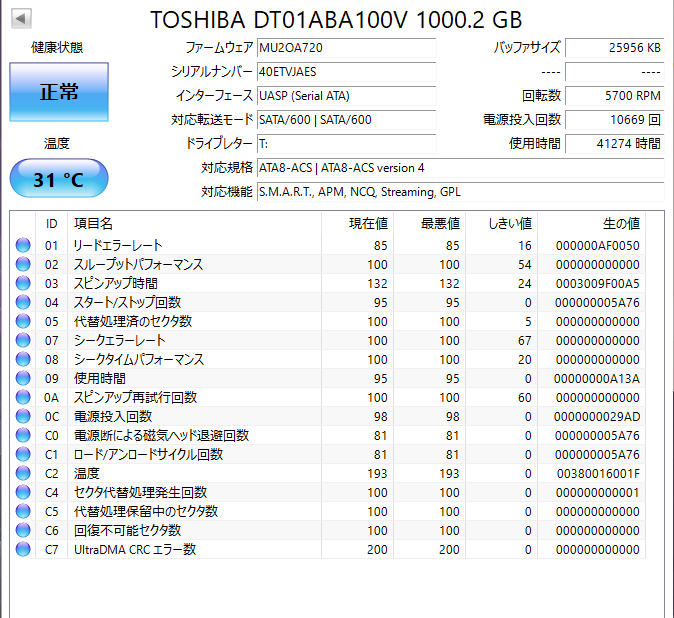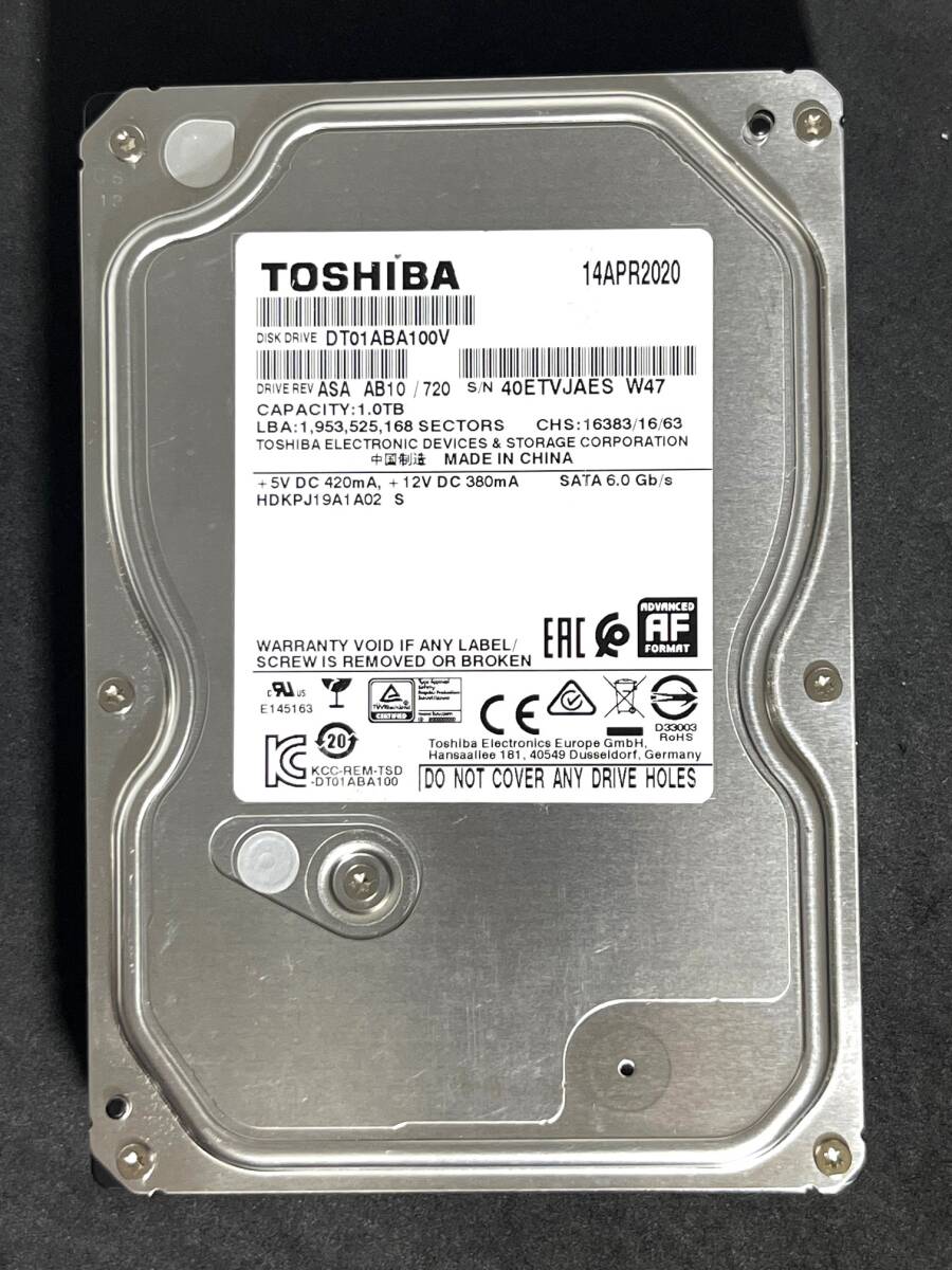 ★ 1TB ★ DT01ABA100V / TOSHIBA 2020年製 【使用時間:41274h】 良品 3.5インチ内蔵HDD SATA AVコマンド対応 1000GB [管■57JA]