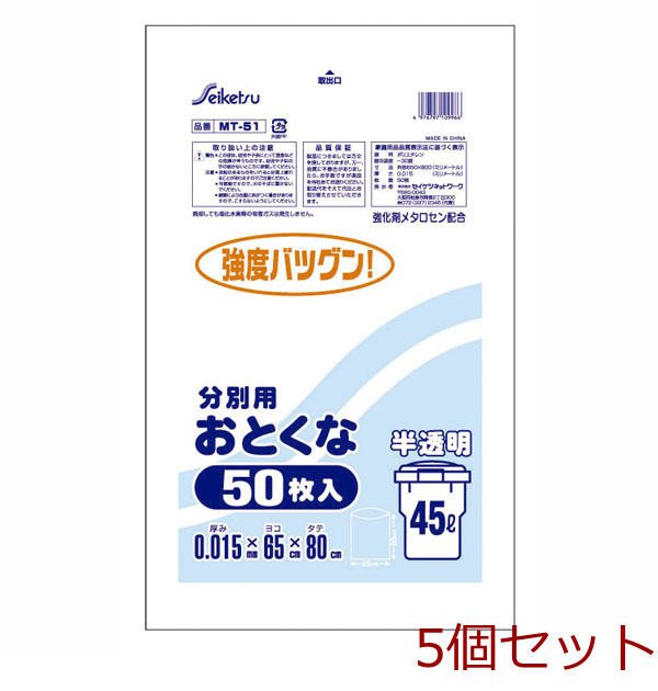 おとくな分別用45L 50枚入 半透明 生産地 中国 サイズ 商品サイズ:厚み0.015×ヨコ650×タテ800mm ケースサイズ:W355×D230×H210mm 素材 メタロセン配合ポリ袋 HDPE 注意事項 火のそばに置かないで下さい。 ブランド セイケツネットワーク |