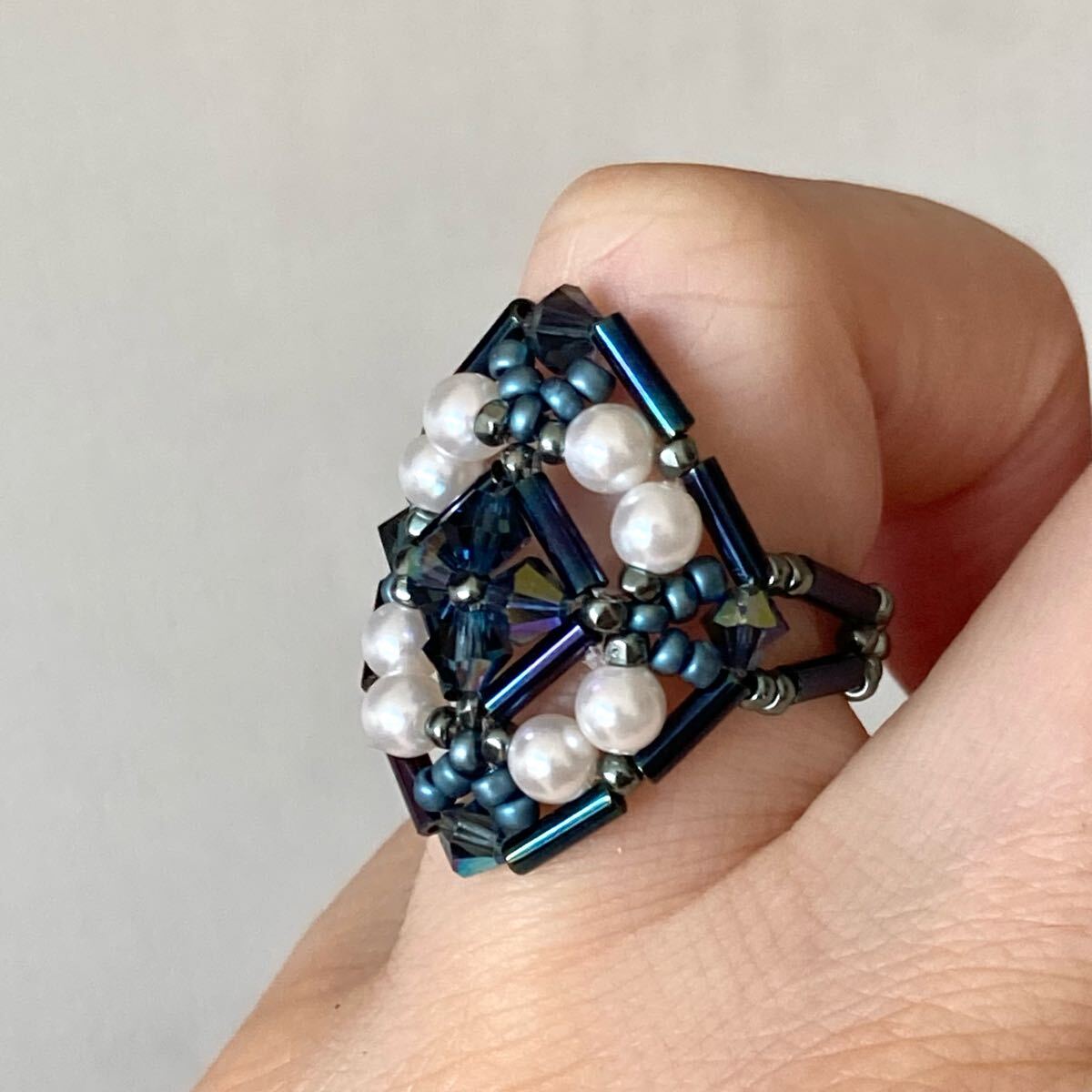 ビーズ リング  指輪 ハンドメイド スワロフスキーとパールビーズのひし形リング ネイビー×白 14-16号です。