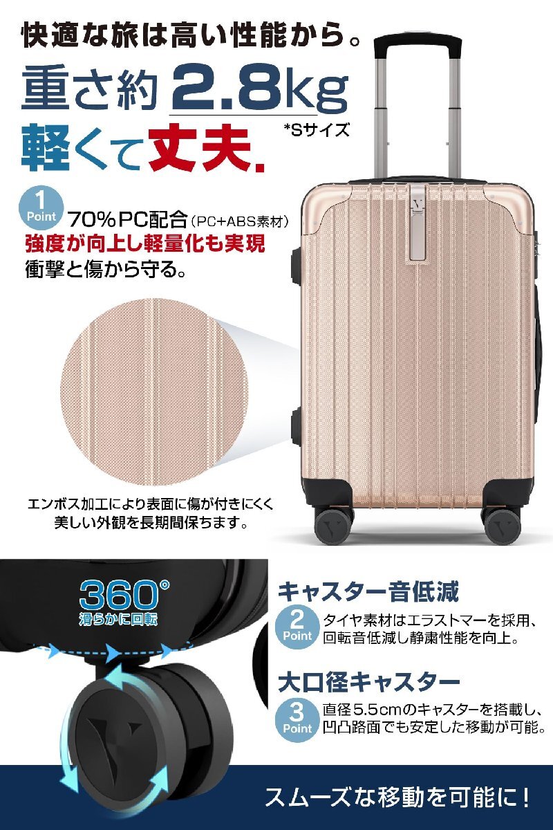 【驚くほど軽量、頑丈なボディ】Sサイズ2.8kgMサイズ3.5kgLサイズ4.2kg持った瞬間、思わず声がでるほどの軽さに仕上げ、PC70%(ポリカーボネイト)+ABS樹脂30%の混合比で作られた頑丈なボディです