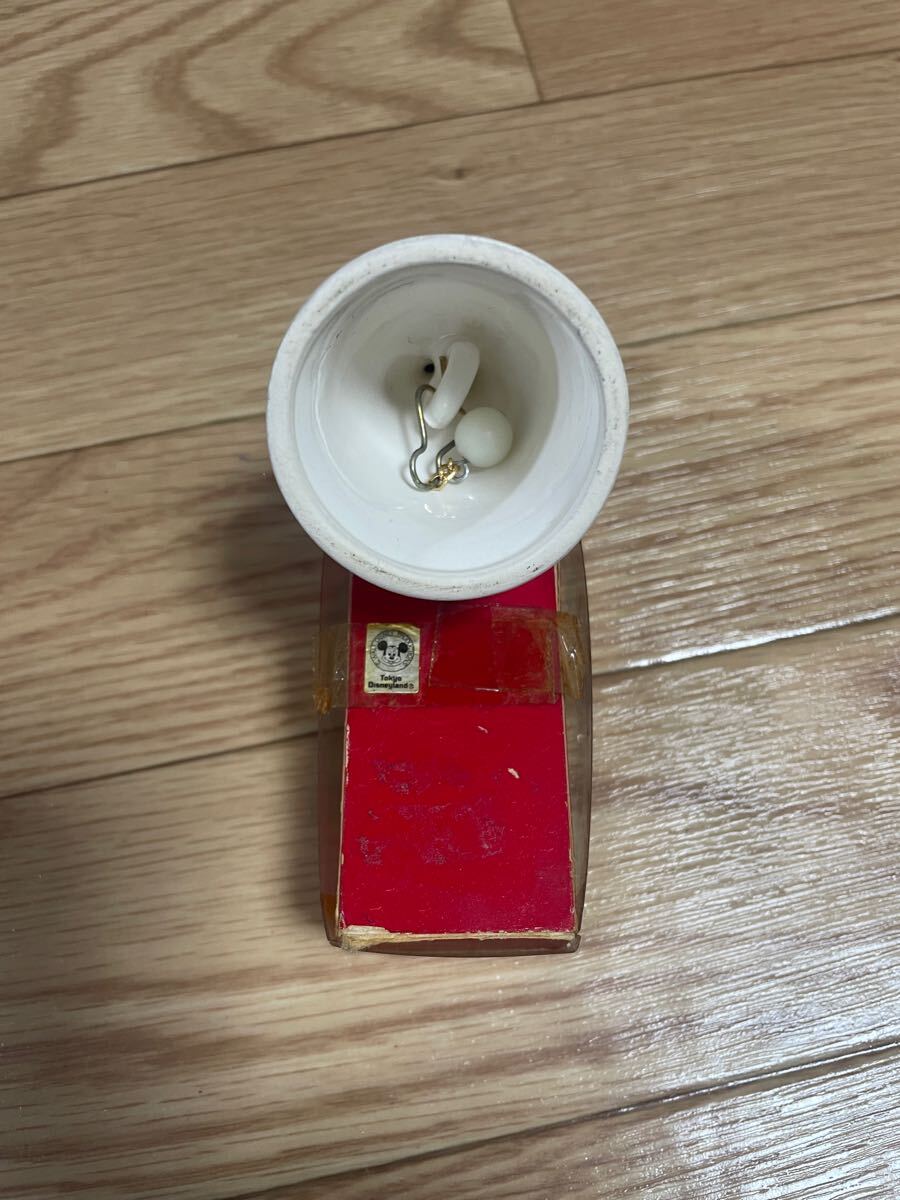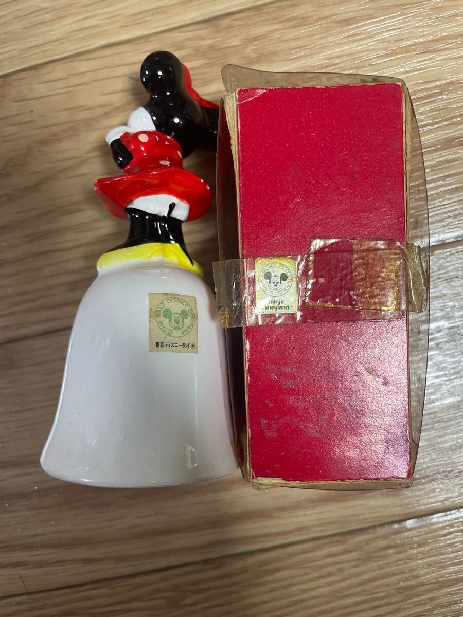 WALT DISNEY PRODUCTIONS刻印入り、1980年代頃の品。可愛らしいミニーが立体で造形された陶器製ベルです。東京ディズニーランド正規品シール付き。やや経年劣化あり。