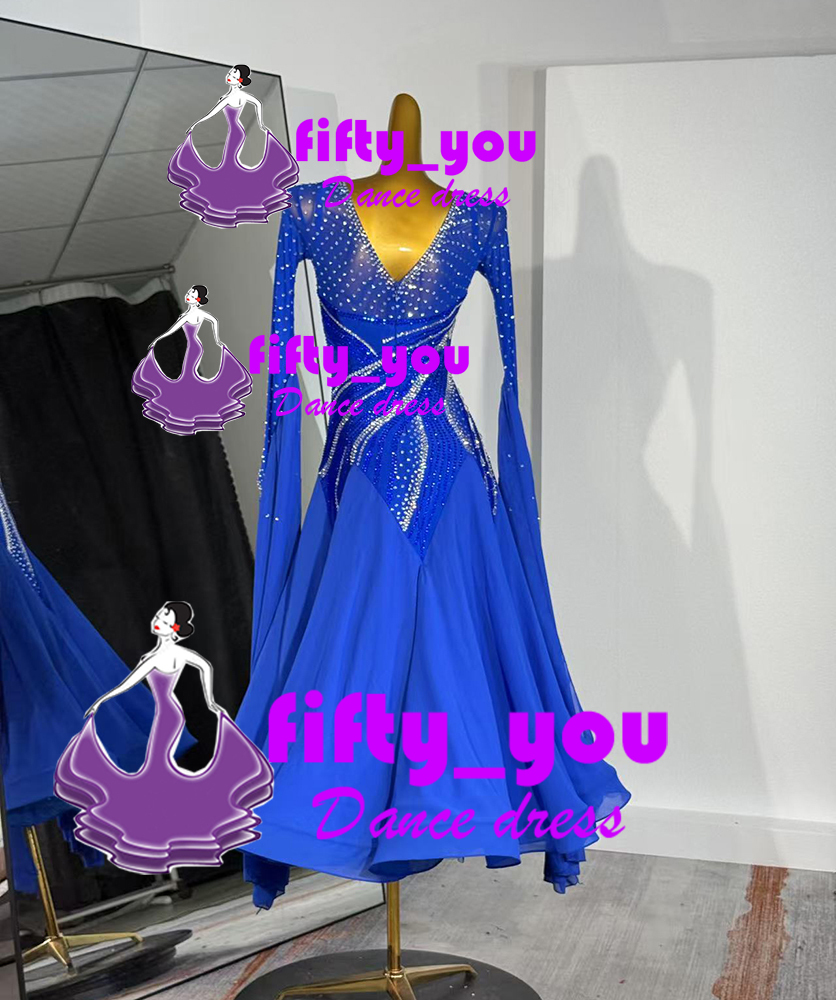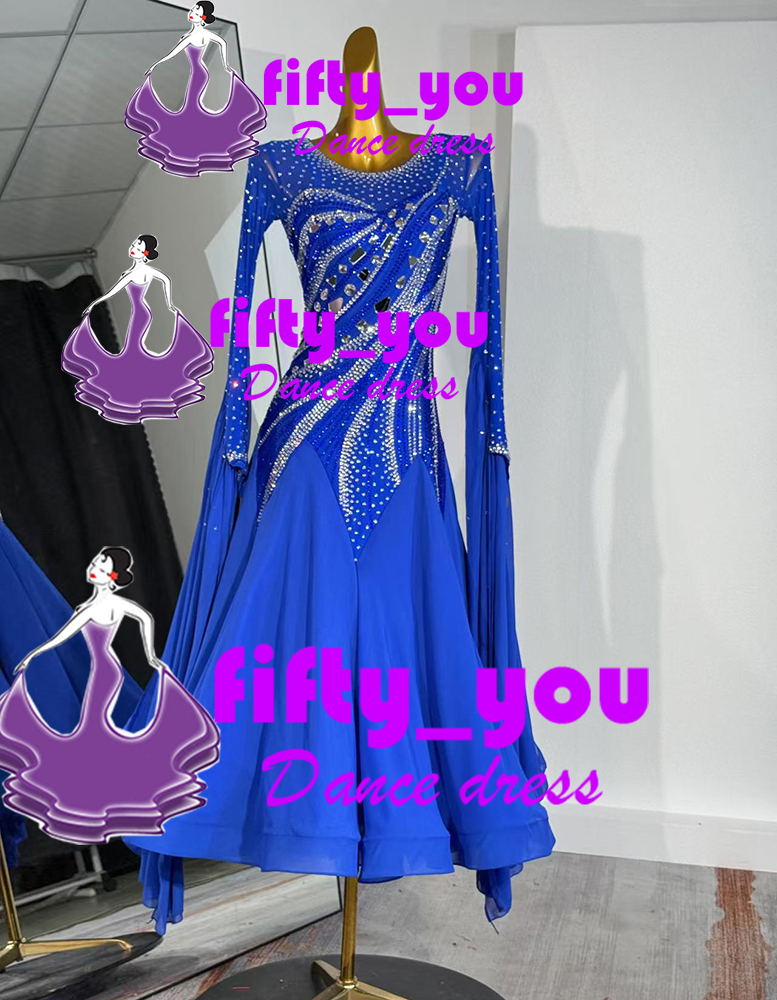新品fifty_you 高品質競技レディース社交ダンス衣装 セミオーダー モダン・スタンダードドレス  キラキラ石飾り ロイヤルブルー