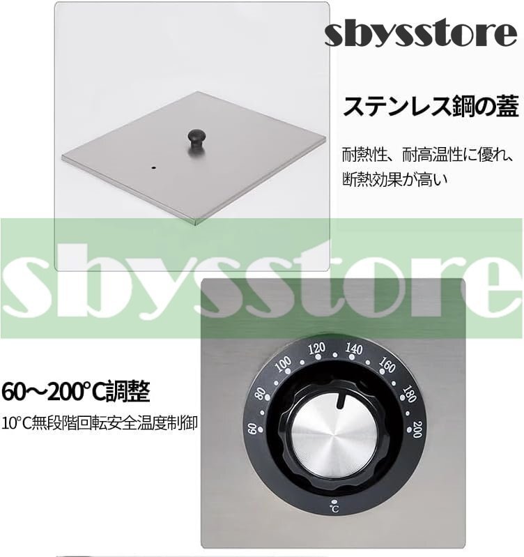 温度範囲:50-300℃ おでん鍋はステンレス鋼で作られて、耐食技術、火傷防止設計、長時間高温環境で作業しても変形せず、頑丈で耐久性がある。内鍋の材質はステンレス鋼で、耐久性があり、硬度が高く、より良い耐食性・耐摩耗性。 おでん鍋の容量が大きくて、複数人前の料理にも対応できる。 鋳造アルミニウム加熱プレート、通常の加熱パイプより熱伝導がより均一で、より速く、長寿命。 油温は50~300℃の温度範囲で自由に調整でき、さまざまな珍味に対応し、さまざまなスナックのニーズを満たすことができる。 分割式のデザイン、内鍋は洗いやすい。 注意事項と免責事項:本製品は固形油(固形バター、固形ラード、ショートニング、エッジオイル、ホイップクリーム等)の加熱には使用できない。 液体油を添加しないと使用できない。
