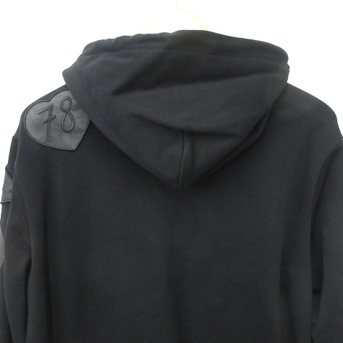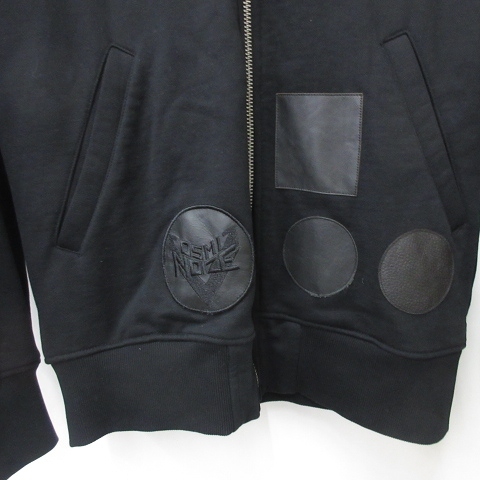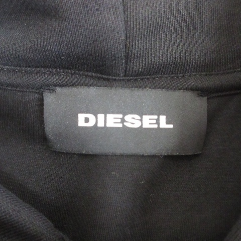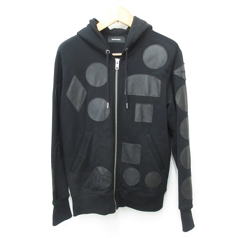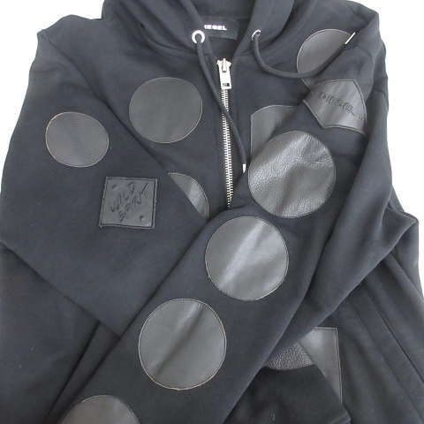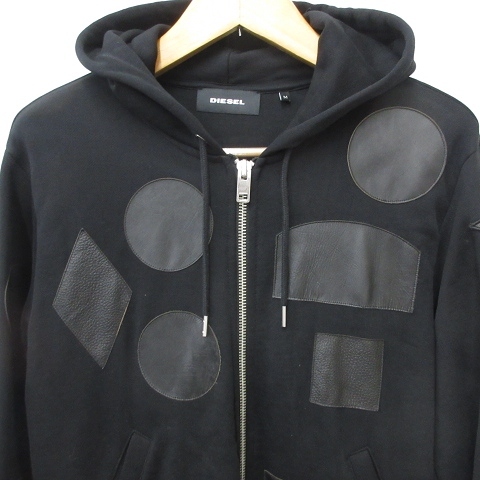 ディーゼル DIESEL パーカー 長袖 ジップアップ フード アップリケ レザー 牛革 スウェット 綿 黒 ブラック M メンズ