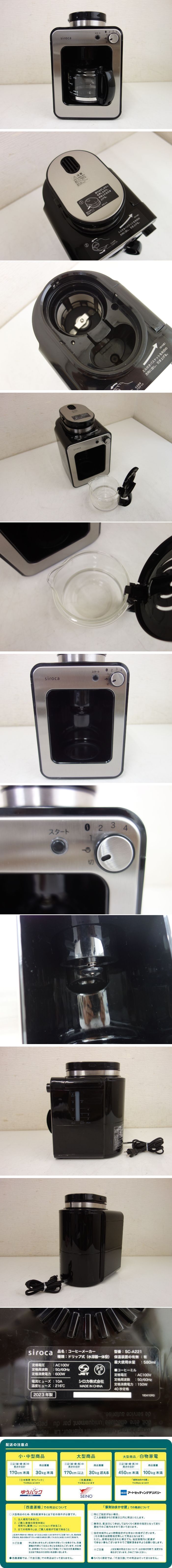 【中古】M▽シロカ コーヒーメーカー 2023年 メッシュフィルター ミル内蔵 豆・粉両対応 蒸らし シルバー SC-A221 (27872)