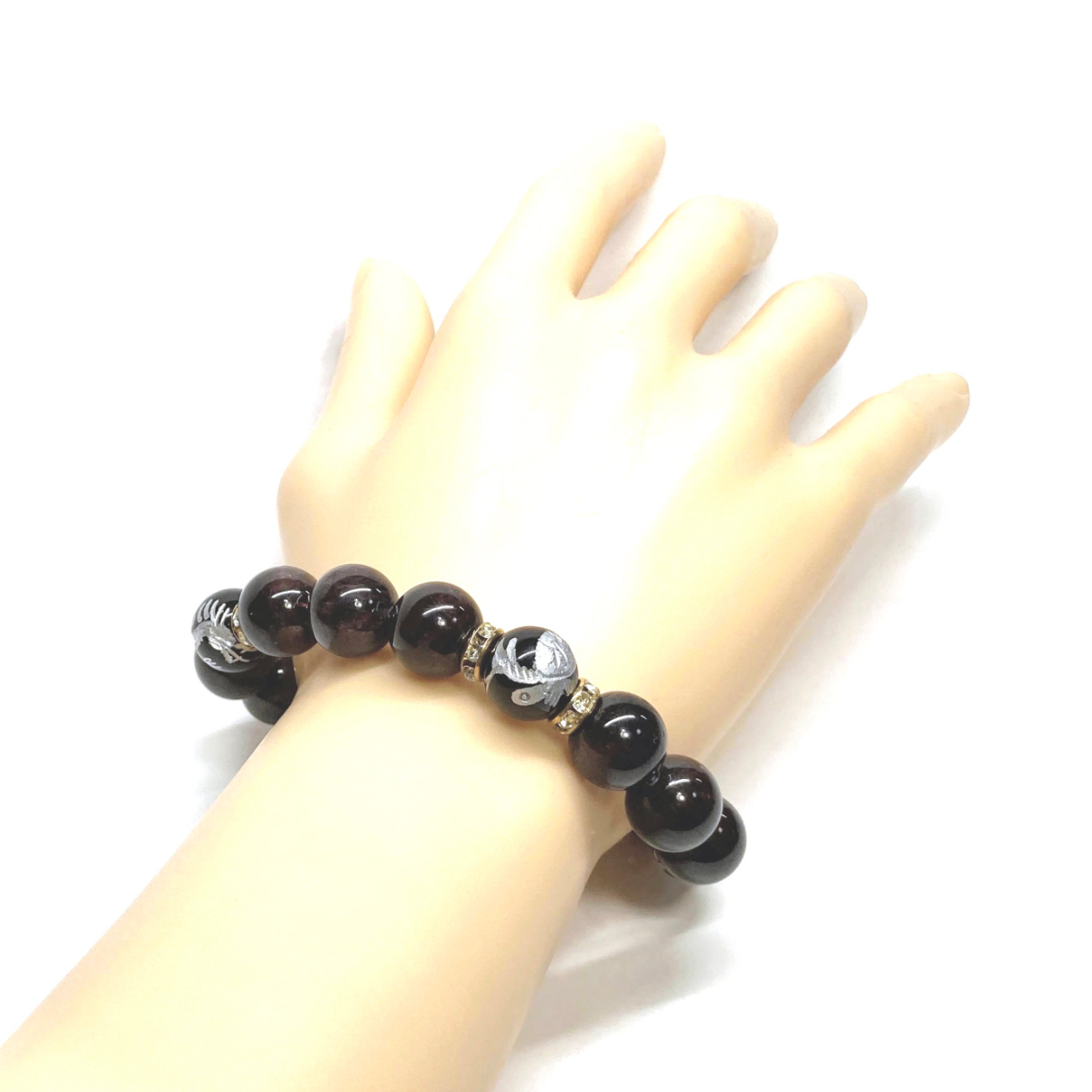 こちらは、四神獣銀彫オニキとガーネットを組み合わせたパワーストーンブレスレットです。四神獣は、中国の伝説で4つの方向(東西南北)を守護する神聖な神。四神獣、厄災から身を守り、多くの運気を呼び込むと言われております。石大きさは程よくインパクトのある12mm玉で内周 約17cmです。 数に限りがございますので気になる方はお早めにどうぞ。