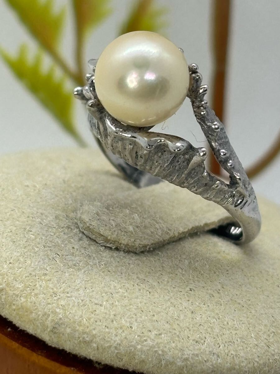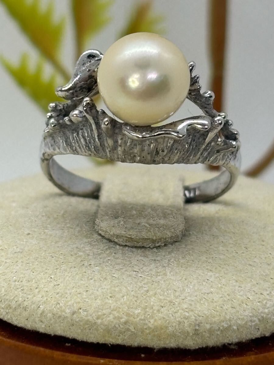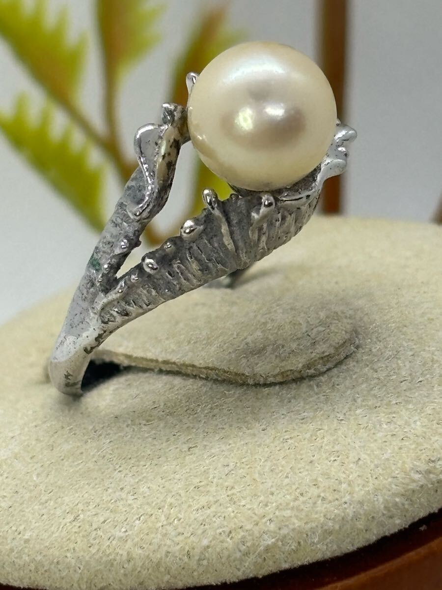 波の形状が特徴的なリングに真珠が輝くデザイン。