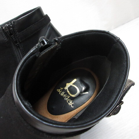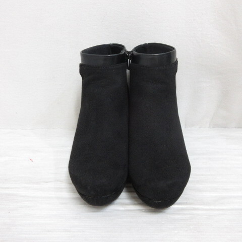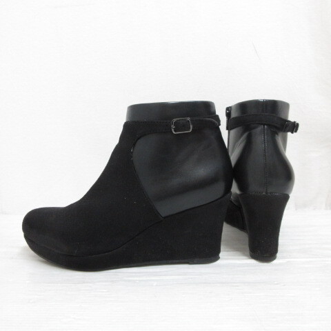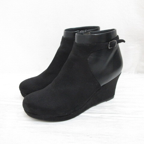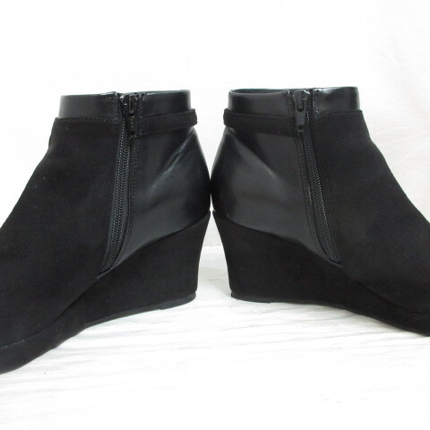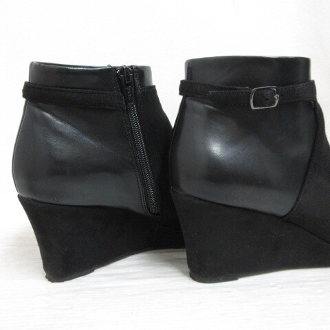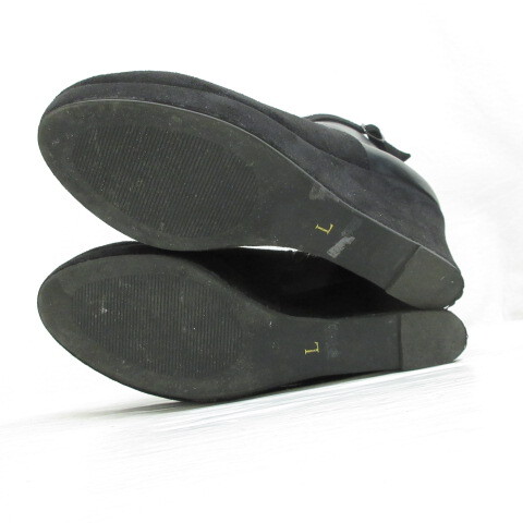 あしながおじさん スエード地 x レザー 切替え ショート ブーツ ブーティ L 黒 ブラック 靴 シューズ サイドファスナー ウエッジソール