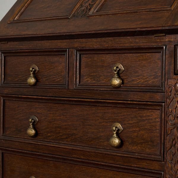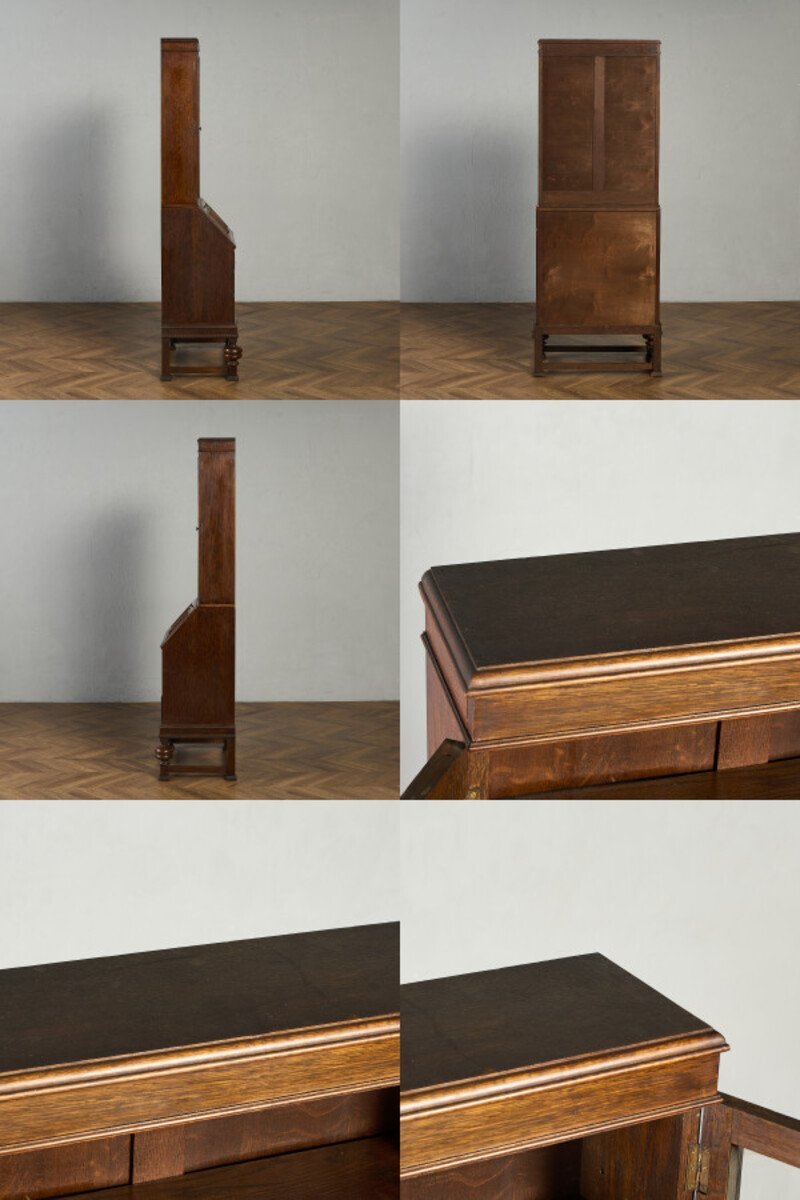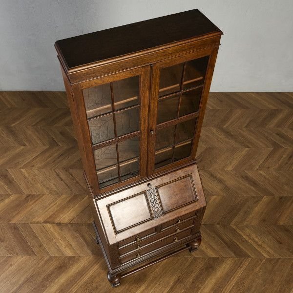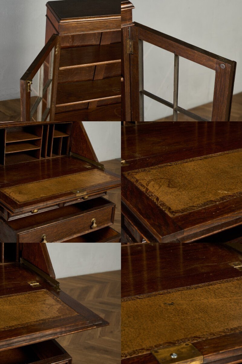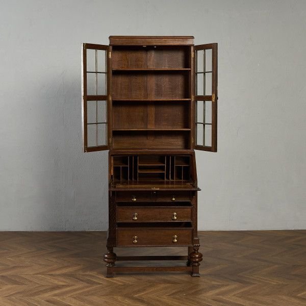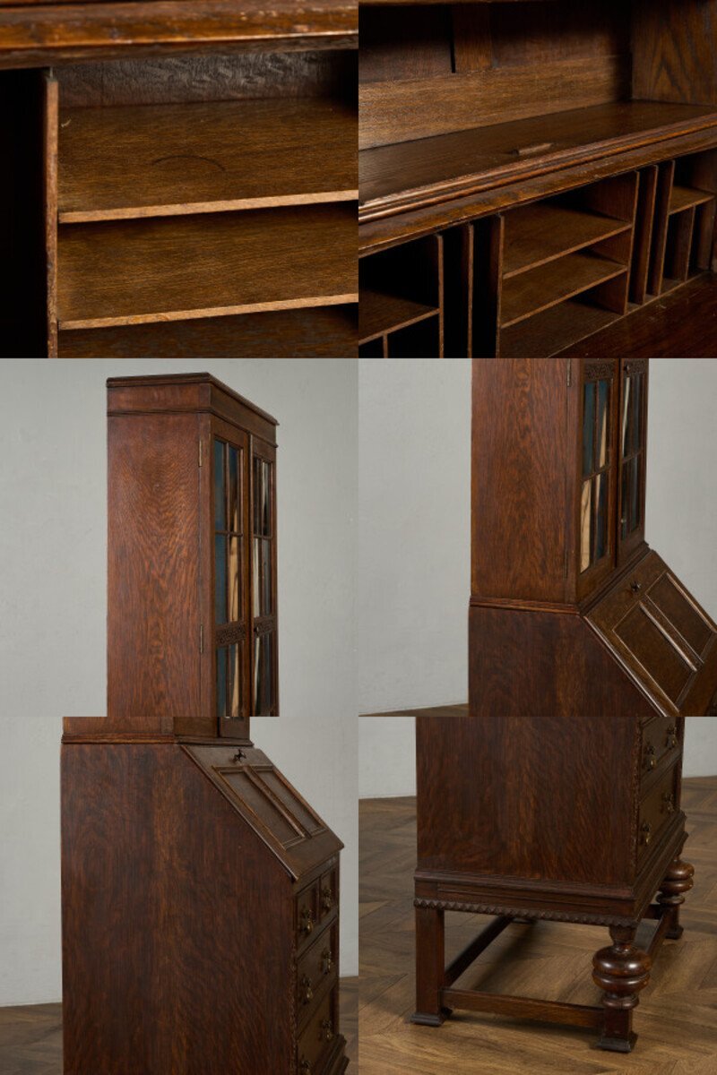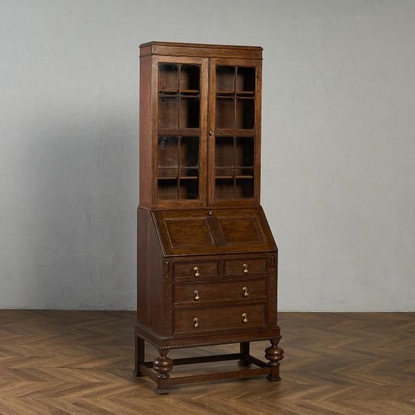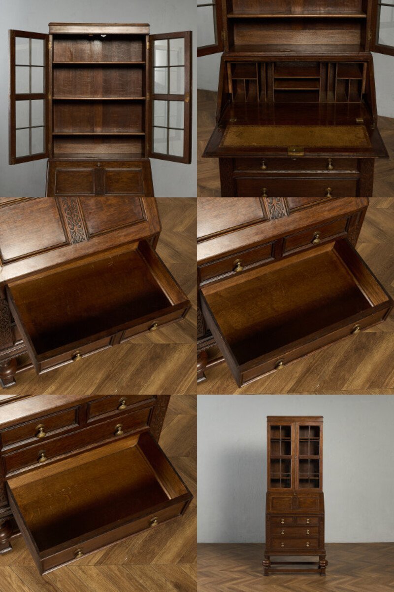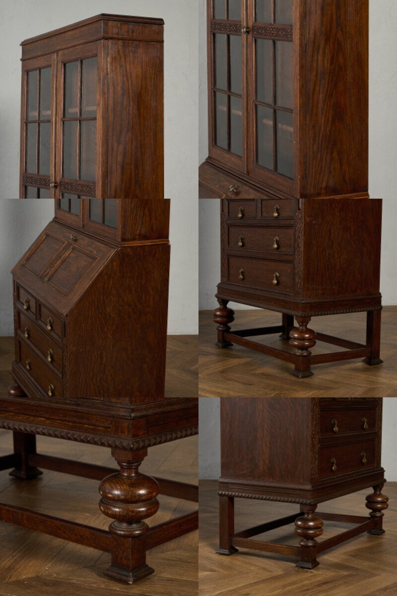 英国クラシック ビューローブックケースです。 立体的な木彫装飾が施されたバルボスレッグなど、随所にこだわりのディテールが光る、上質なビューローブックケース。ライティングビューローとブックケースが一体となったデザインで、高い収納力が魅力です。限られた空間を有効活用できる実用性に加え、コレクションのディスプレイなどショーケースとしても活躍します。 |